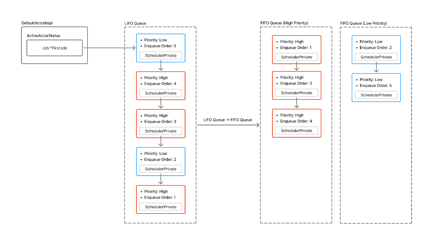 Default Actorにジョブがエンキューされると、初めにこちらのLIFOキューの先頭にジョブが追加される。このLIFOキューへのジョブの追加は、ロックフリーなアトミック操作である、かつこの時点では優先度順のソートも行われない、そのため、複数のスレッドからジョブの追加が可能であり、かつ非常に高速に完了する。