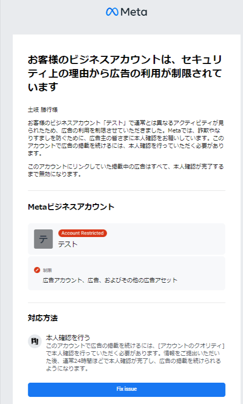 「広告の利用が制限されています」というタイトルのメールが来ていました。