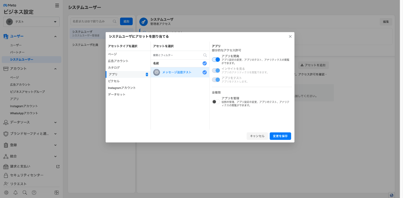 APIで使用するのは、システムユーザーアクセストークンが良いようです。