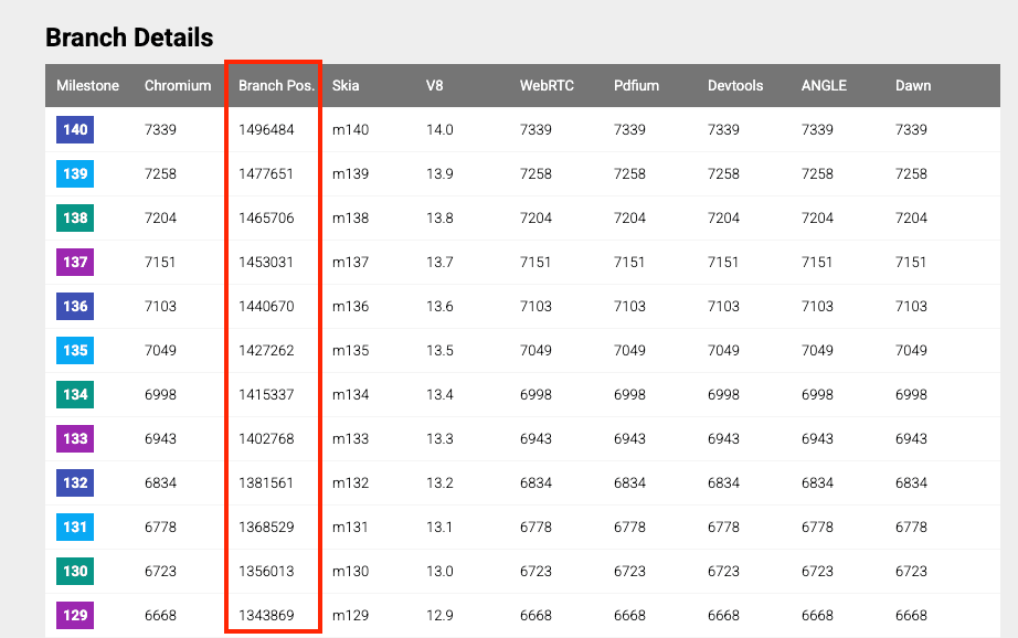 - Branch Base Position: Chrome のリリースブランチが作成されたときの Chromium リポジトリ内のコミット位置。
