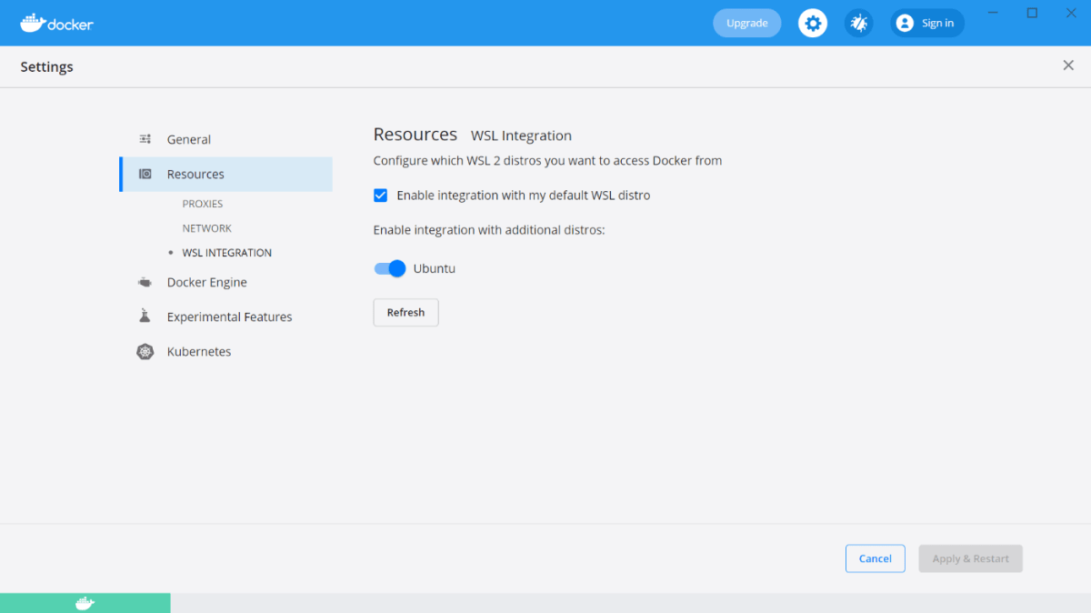 We recommend to activate the WSL integration in Docker Desktop settings.