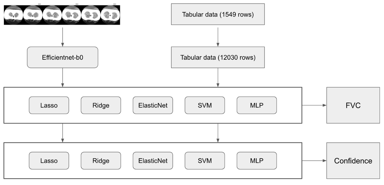 これまで紹介してきた解法は何らかの形でCT画像を使っていましたが、そもそも画像データを一切使わない解法もありました(5位、10位など)。やはりというか、ある任意の時点の画像情報によって患者の予後を予測することの難しさがうかがえました。画像を使わずとも、リークしないようなValidation Strategyを樹立(10位は、患者ごと最後の3つのFVCによってさらにグループを作っていた)し、Noiseを加えたりOverfitを避ける工夫(5位)があれば、画像なしでもチャンスがあったようです。