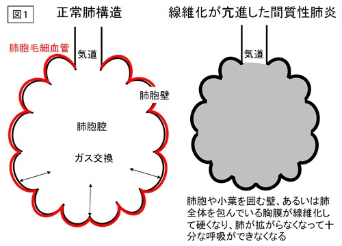 肺胞壁に炎症や損傷が起こり、壁が繊維化(厚く、硬くなること)することで、本来の機能である酸素を赤血球に与え、二酸化炭素を取り出すガス交換が上手くできなくなる希少疾患です。