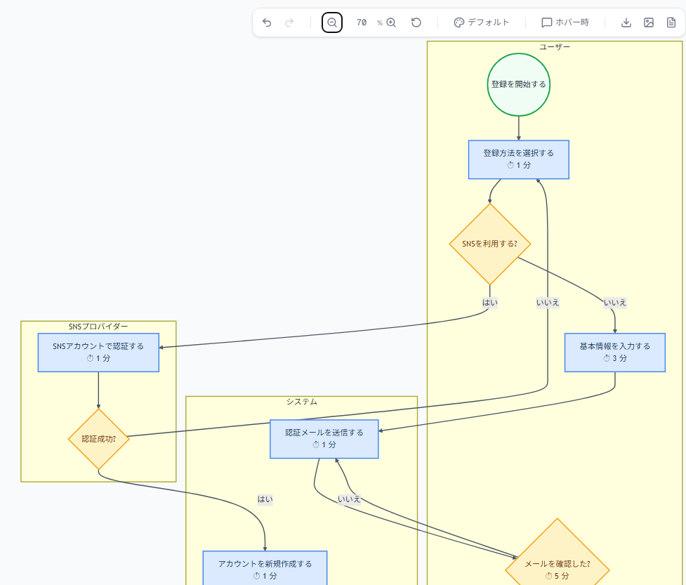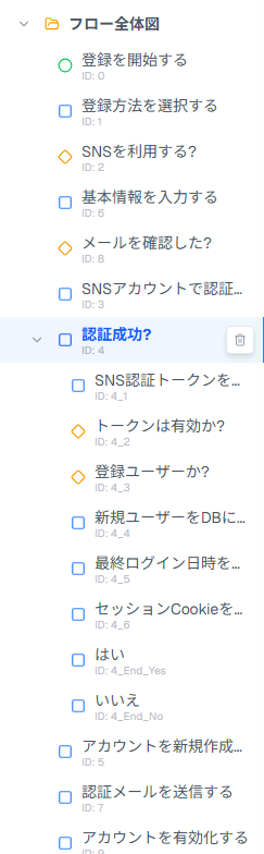 全体図はシンプルに保ちつつ、ノードをクリックすると詳細フローに潜れる。