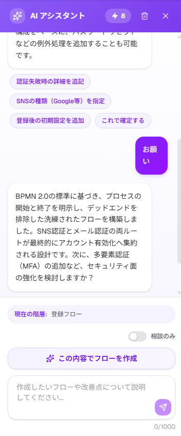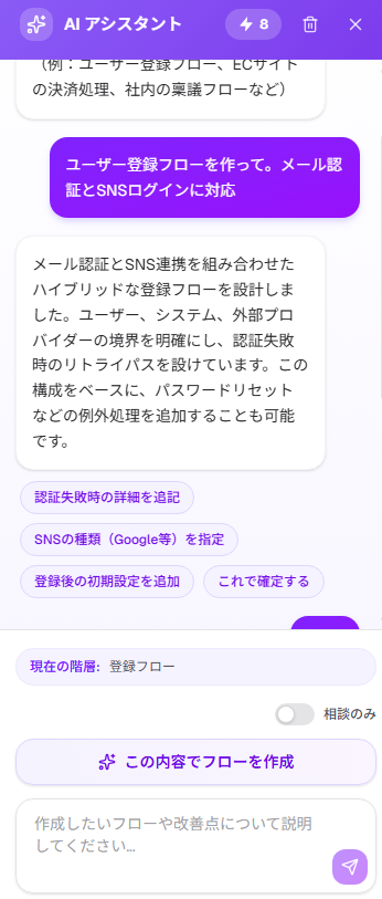 あなた:「ユーザー登録フローを作って。メール認証とSNSログインに対応」