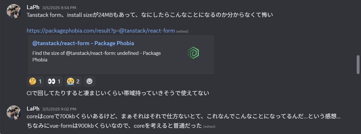 @tanstack/vue-formなどのほかのフレームワークのラッパーは1MBもないのに、@tanstack/react-formだけが24MBもあることに疑問を感じていました。