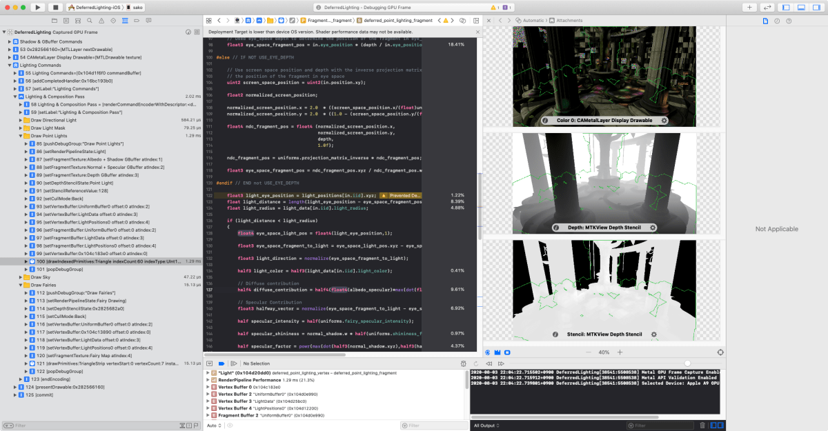 あとは他の手段として、Xcode → Open Developer tool → InstrumentsにMetal GPU Traceというものがありそれでも色々調査できるのだがまだきちんと使いこなせていないので便利な使い方が見つかればまた書く。