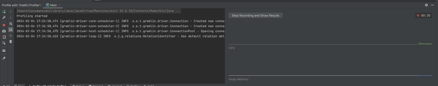 例えば、画像中の "Profile 'Main' with 'IntelliJ Profiler'" を選択すると、他に特別な手続きをせずに実行時のプロファイラを取得することができます。