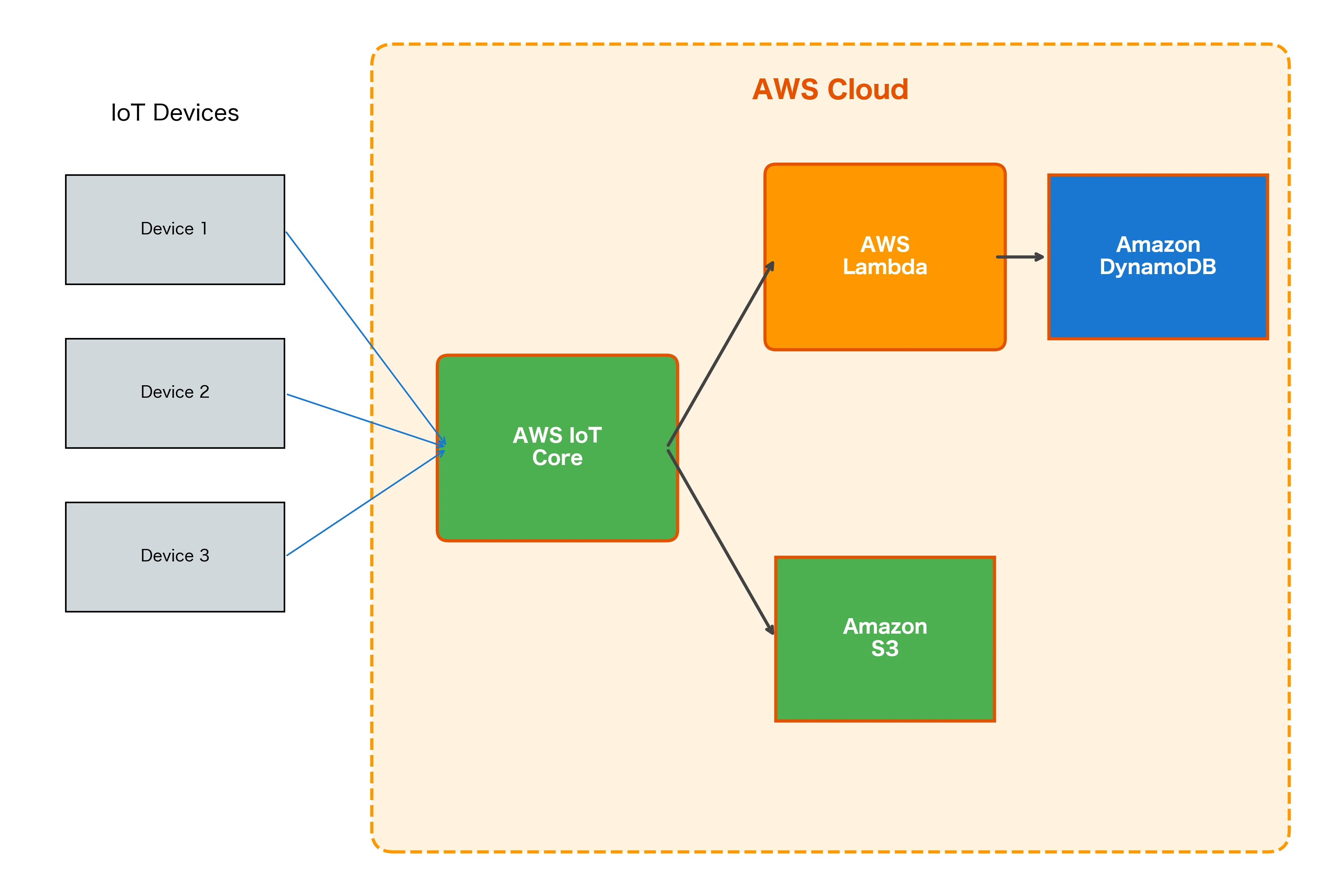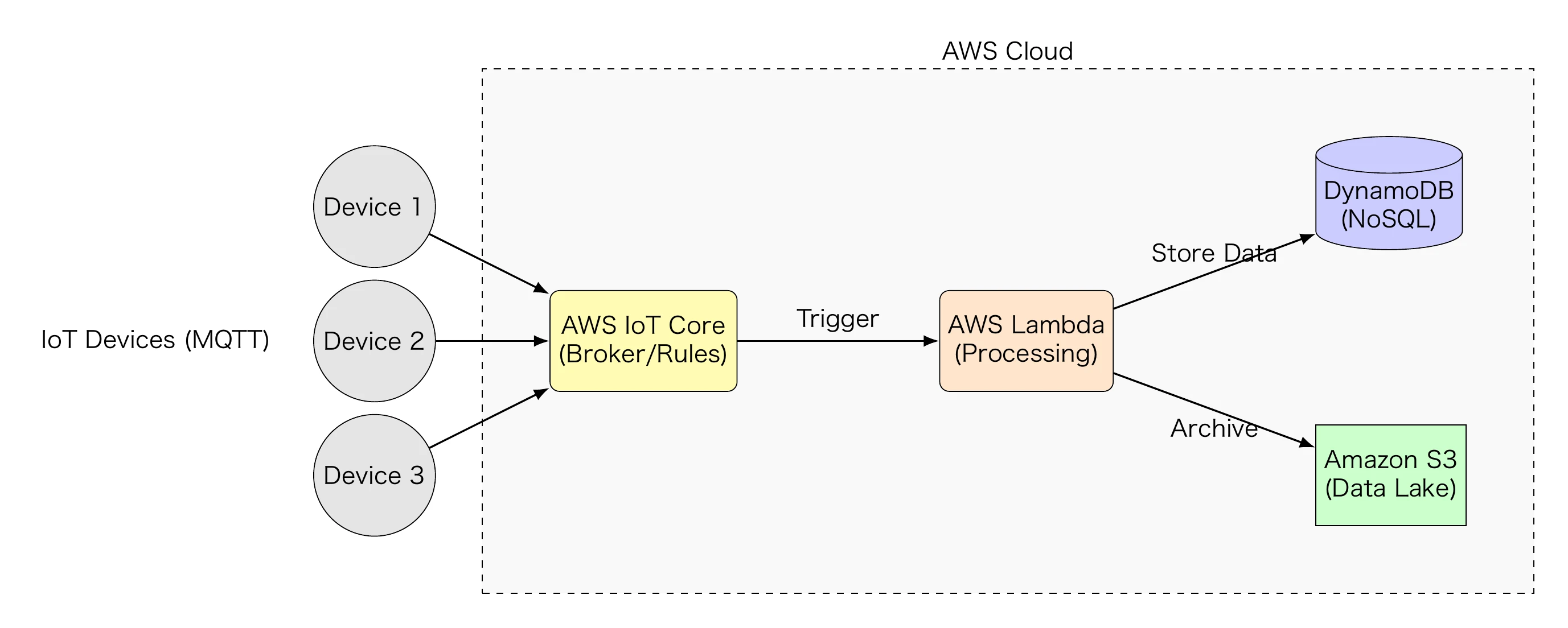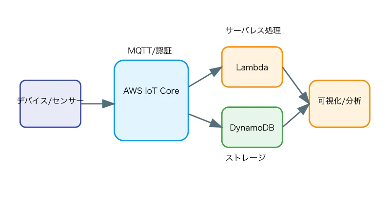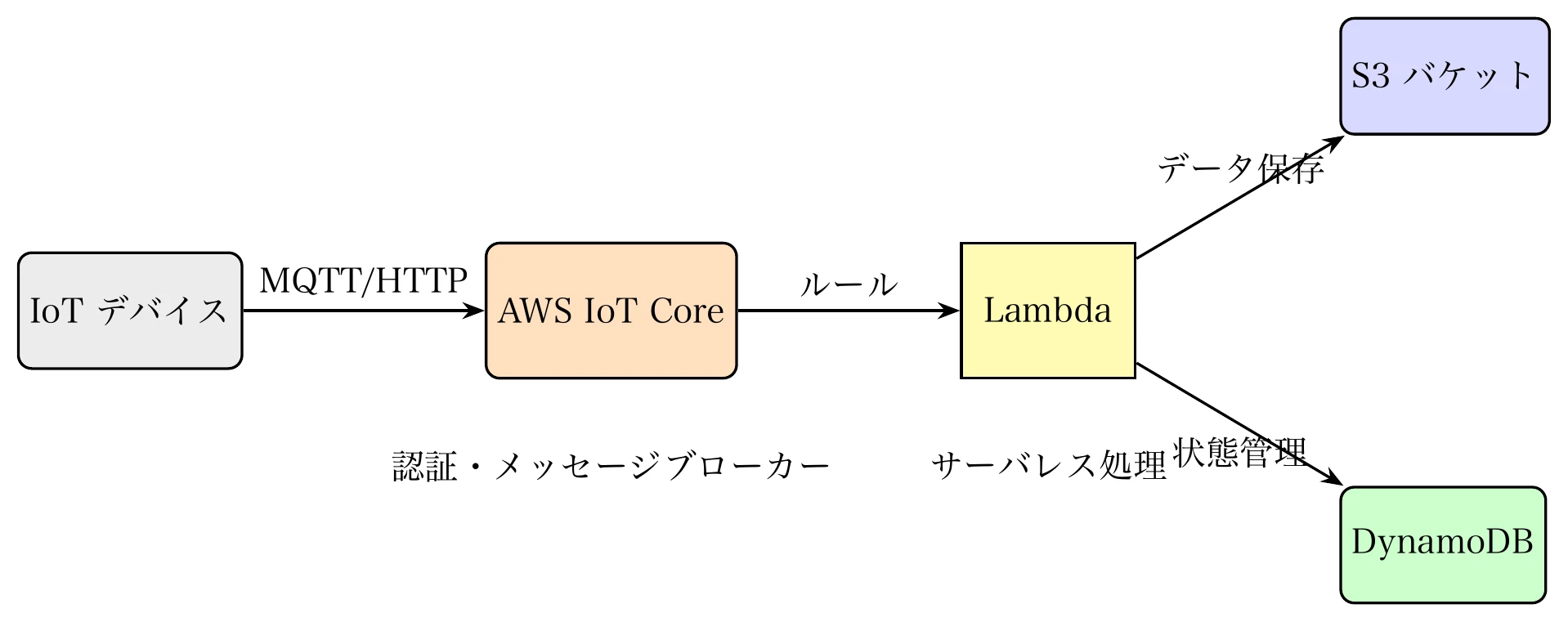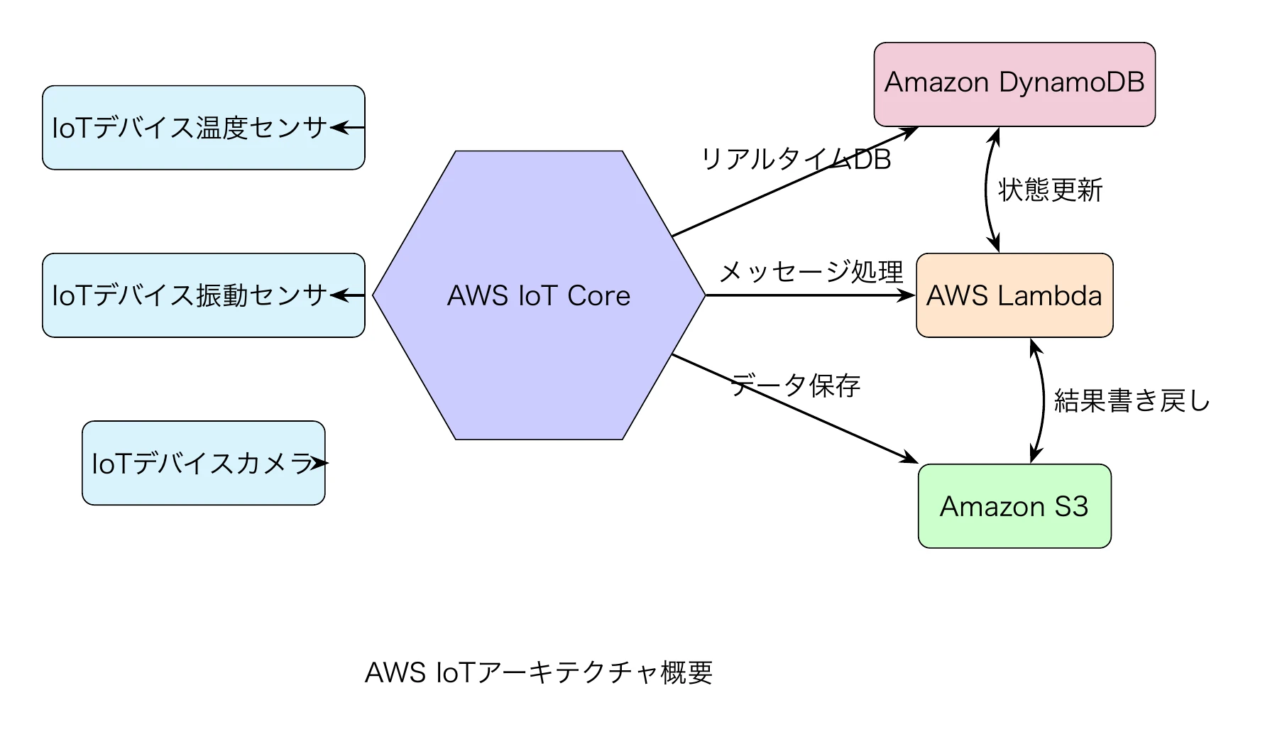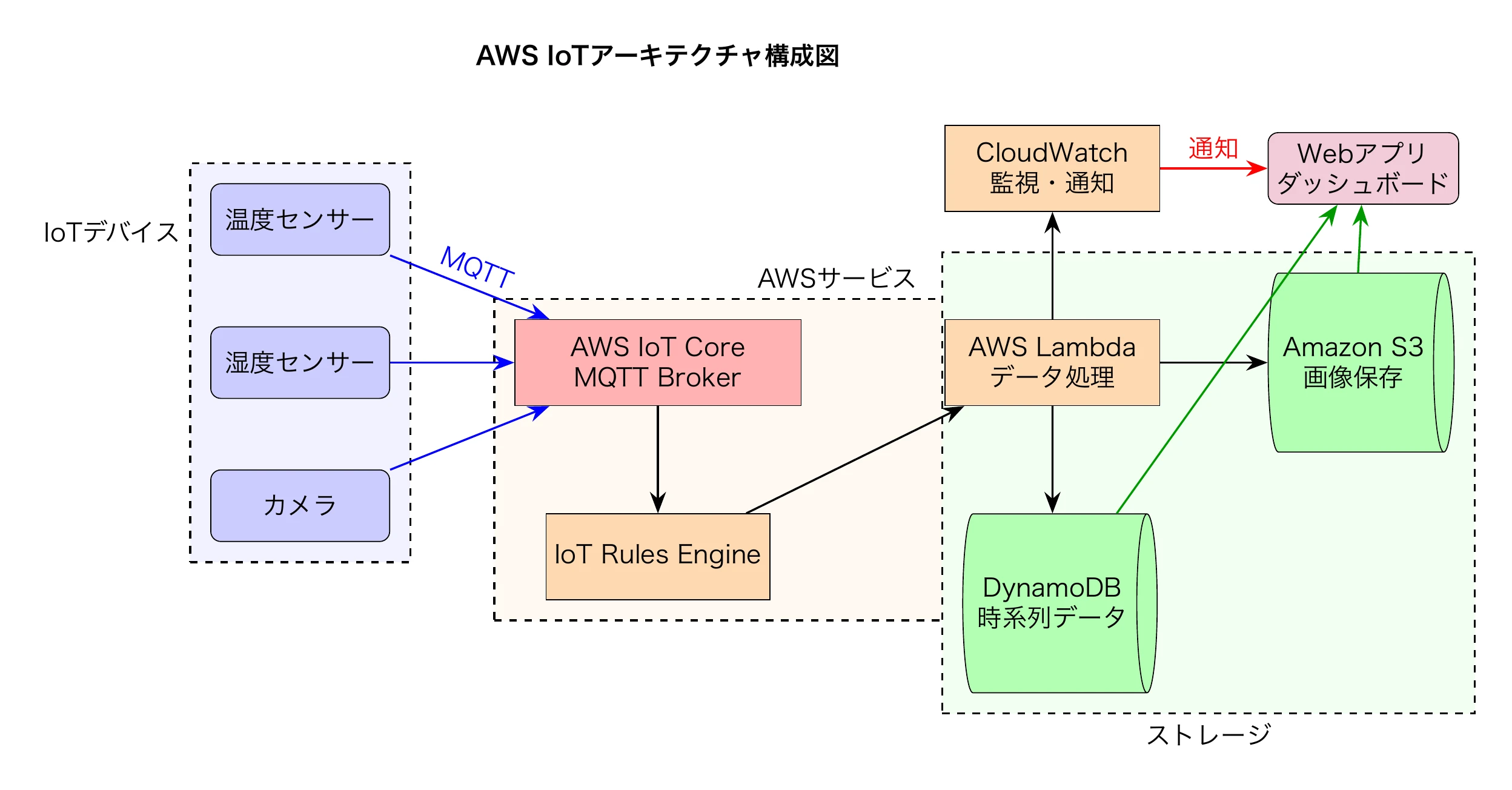 - 各AWSサービスは公式アイコン風のシンプルな図形で表現