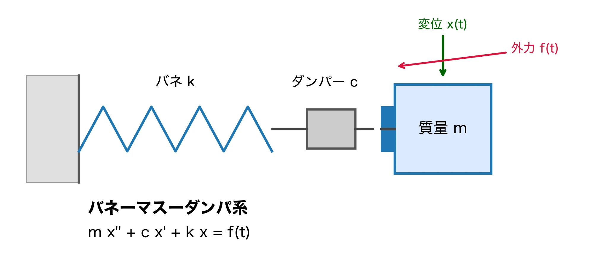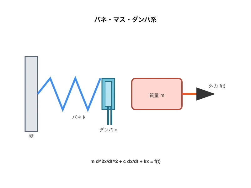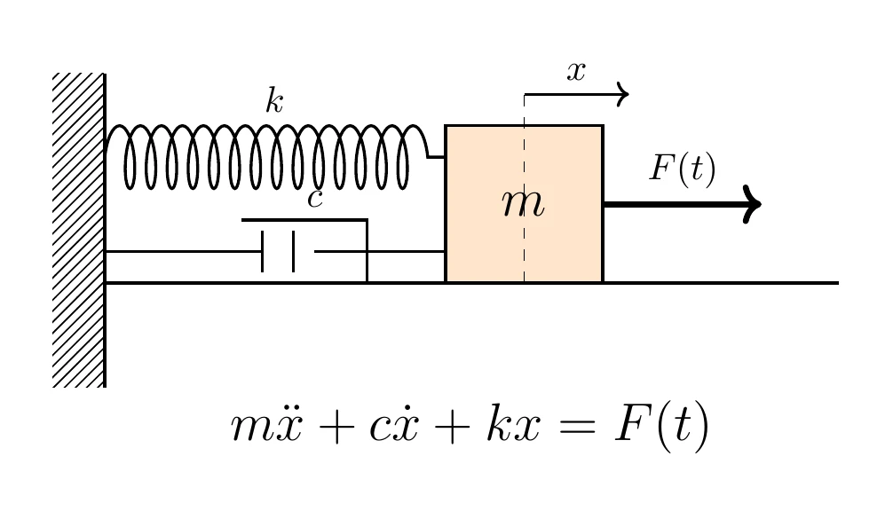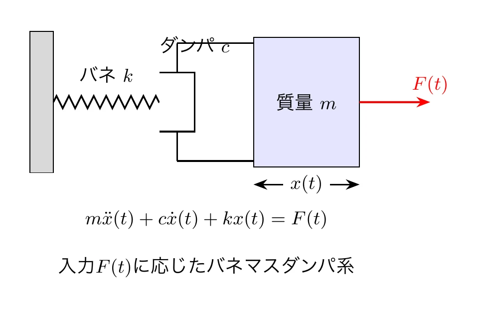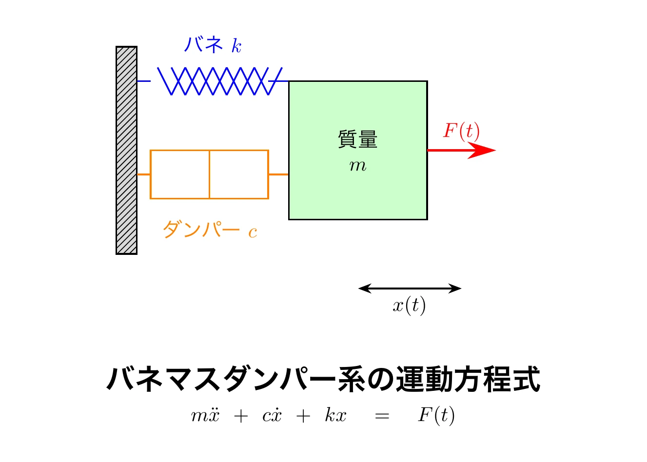 - 運動方程式 m\ddot{x} + c\dot{x} + kx = F(t) を図の下に表示