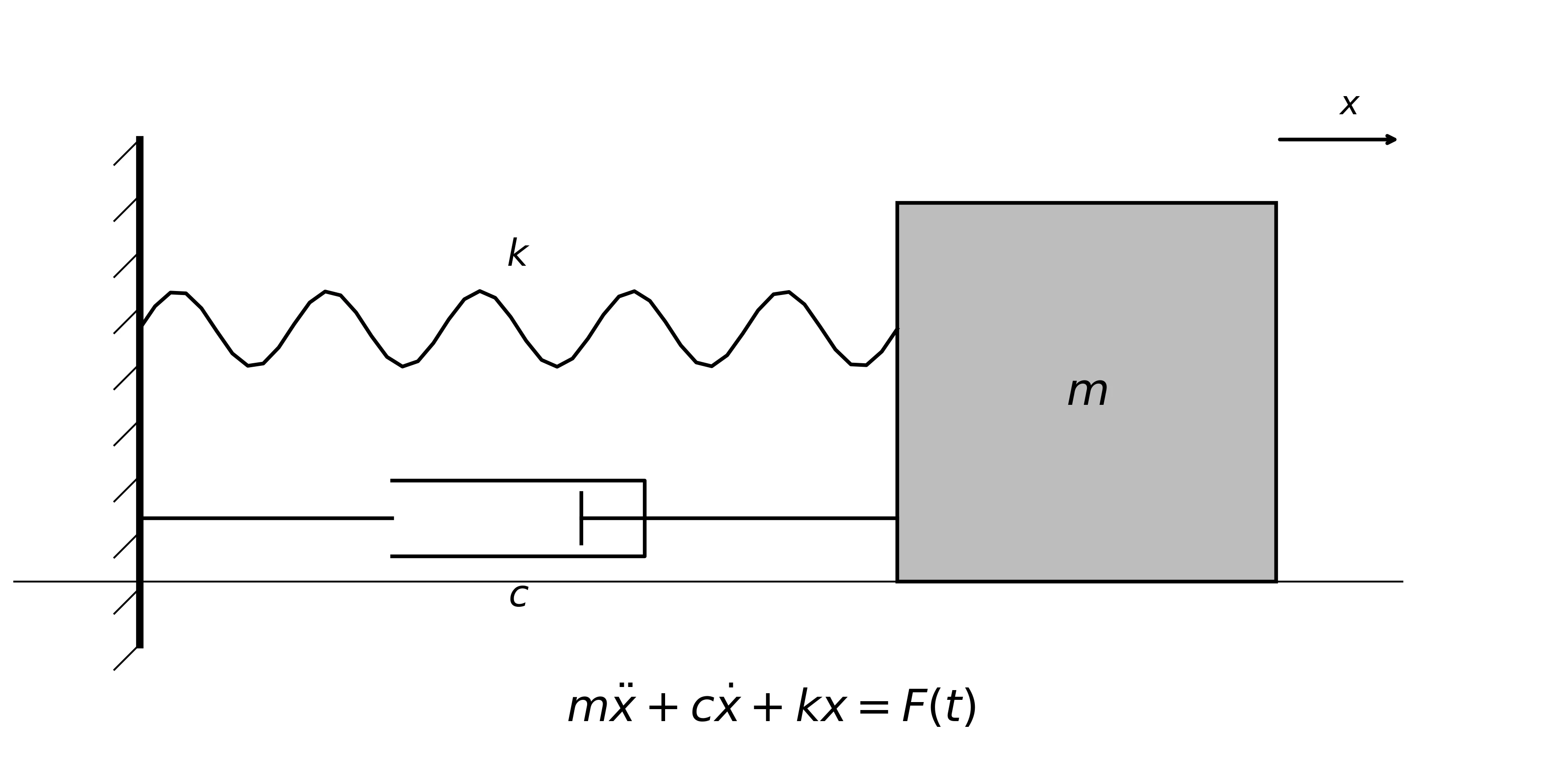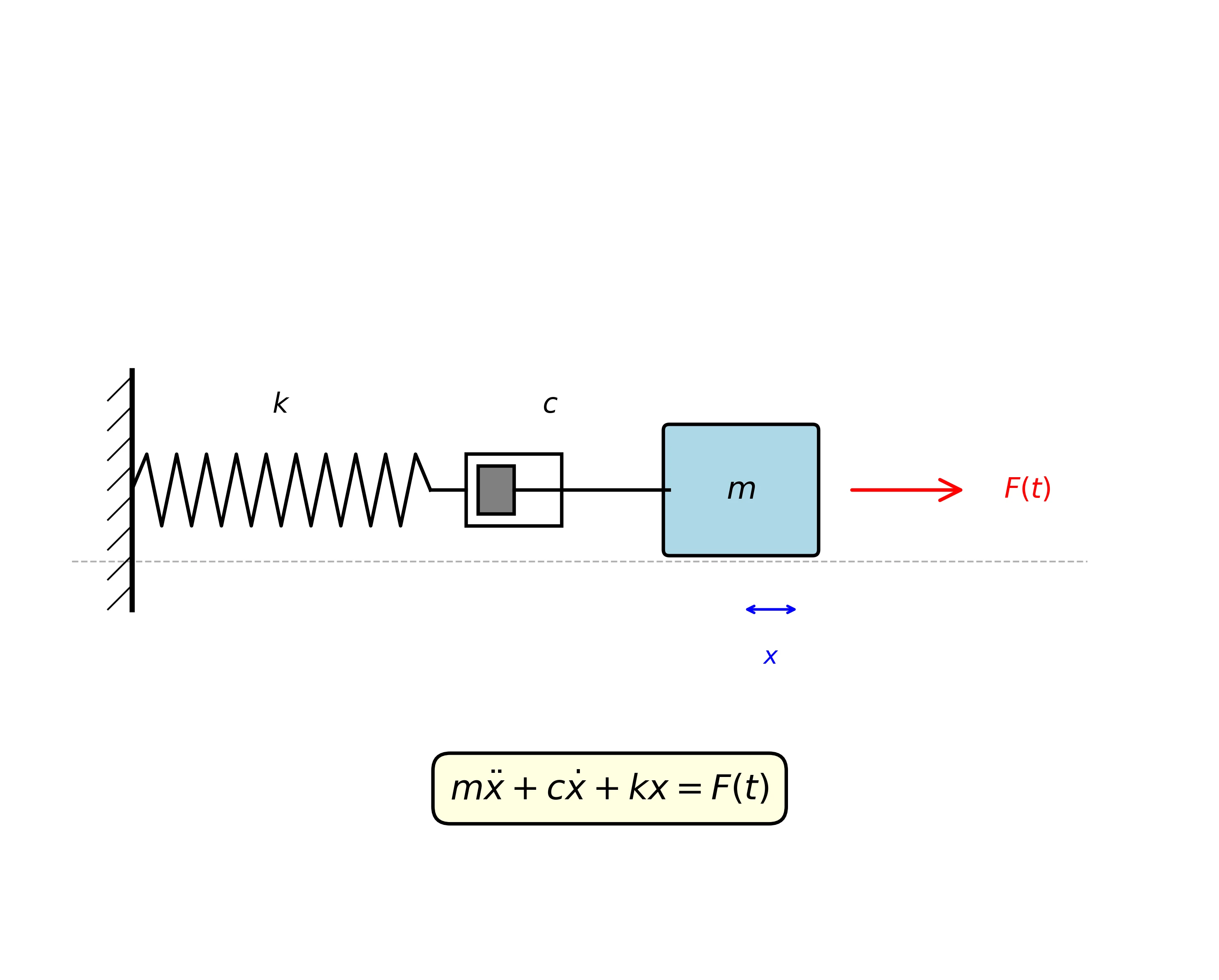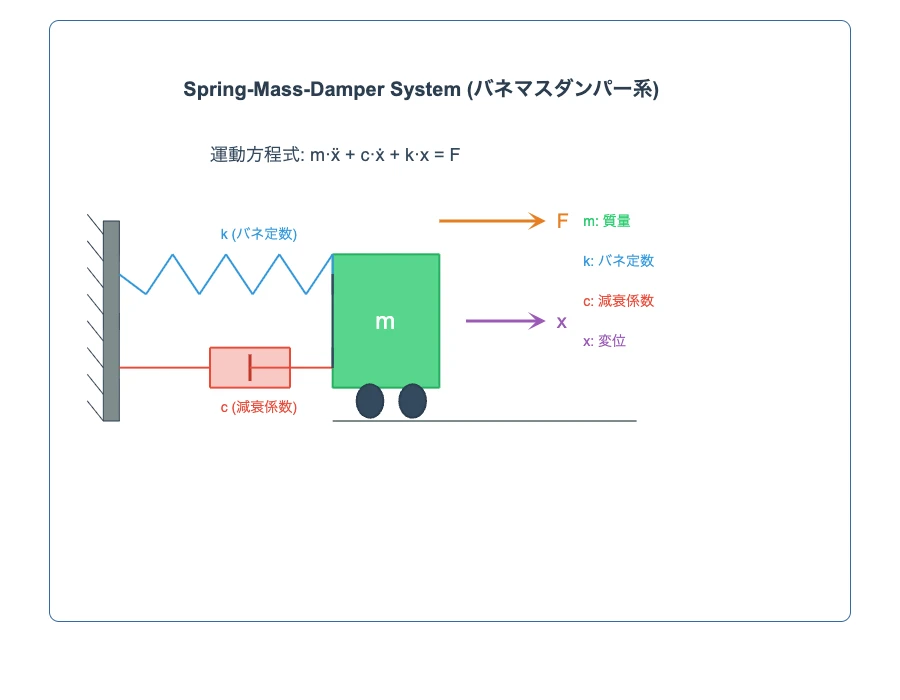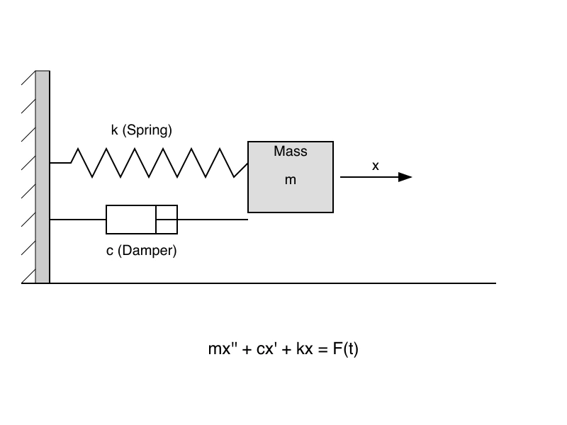 - 運動方程式 m\ddot{x} + c\dot{x} + kx = F(t) を図の下に表示