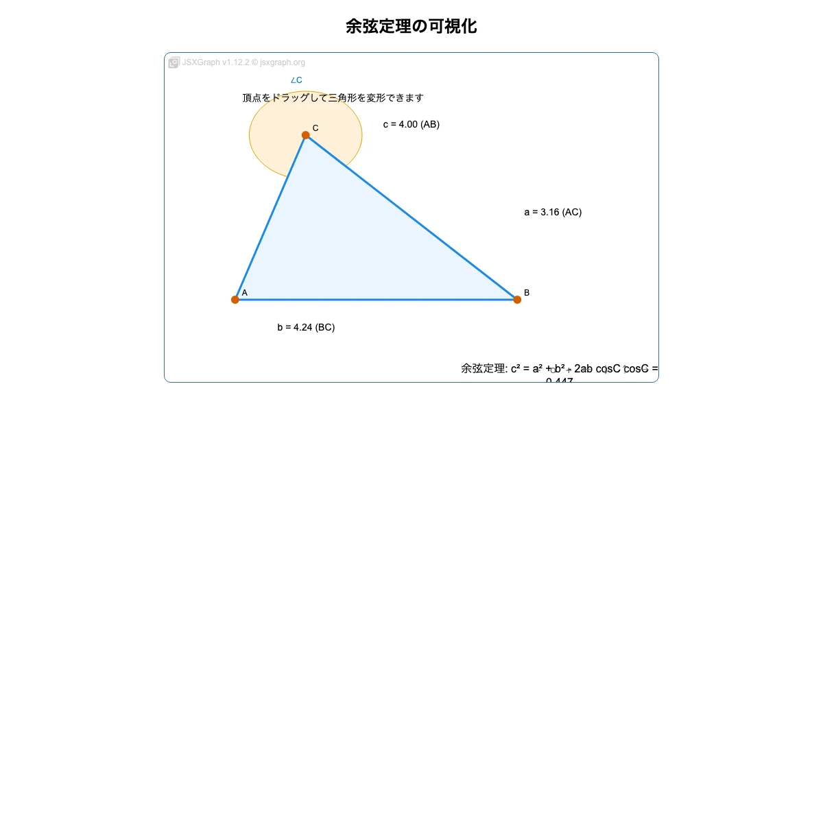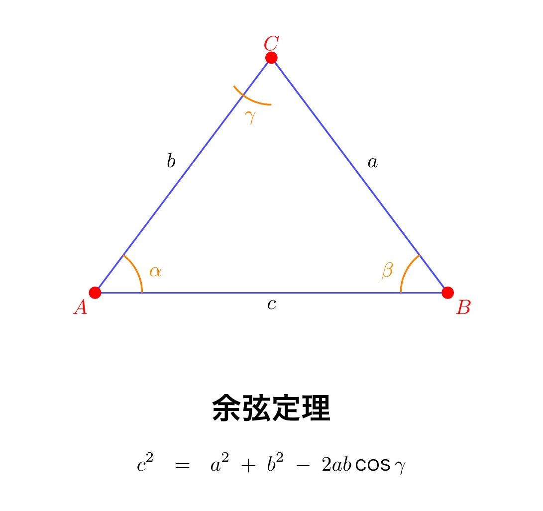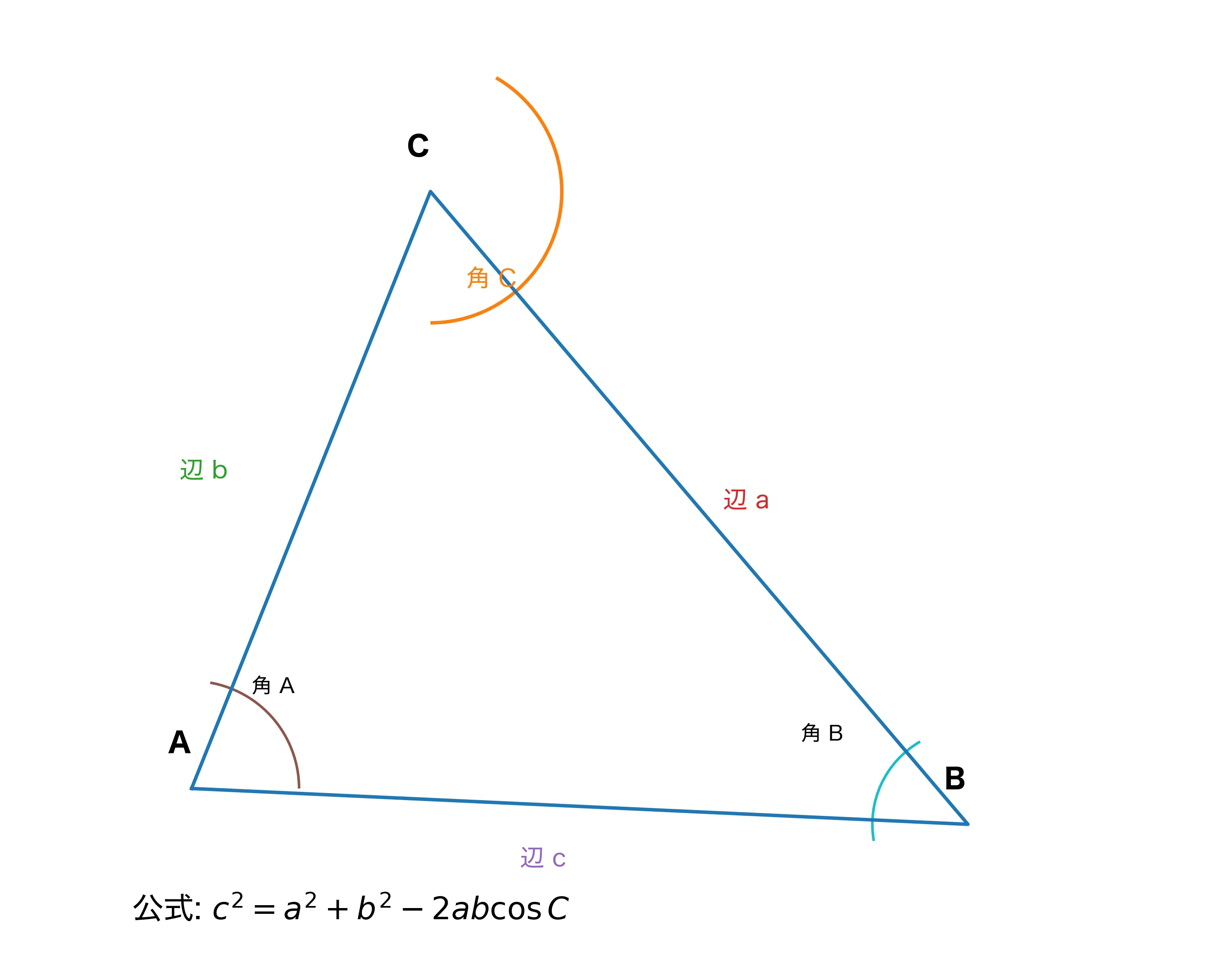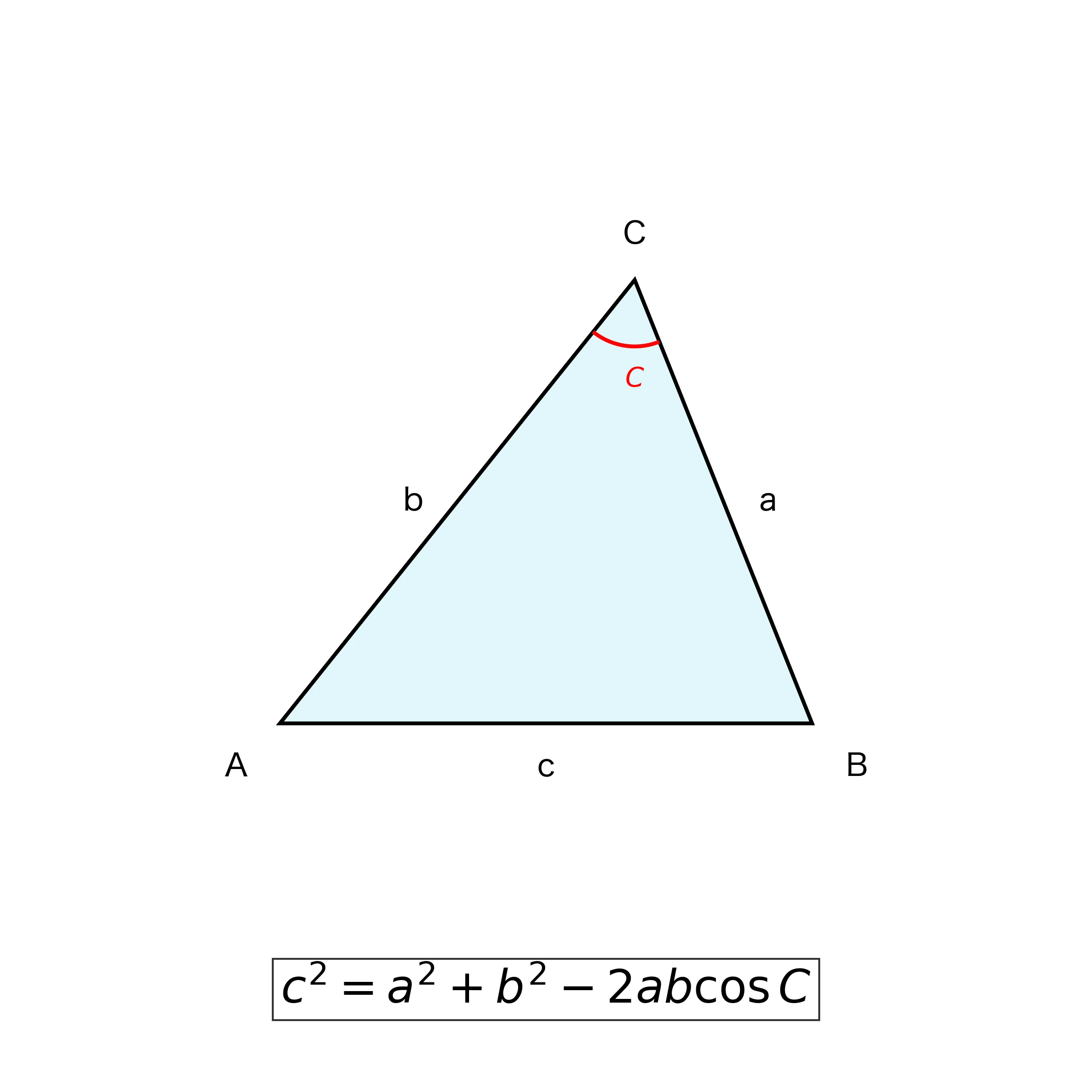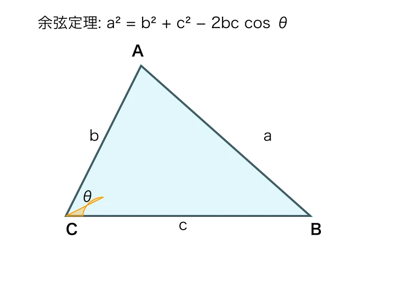 - 公式 c² = a² + b² - 2ab cos C を図の下に表示