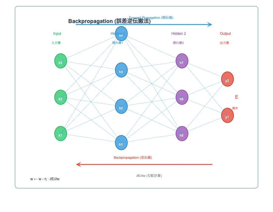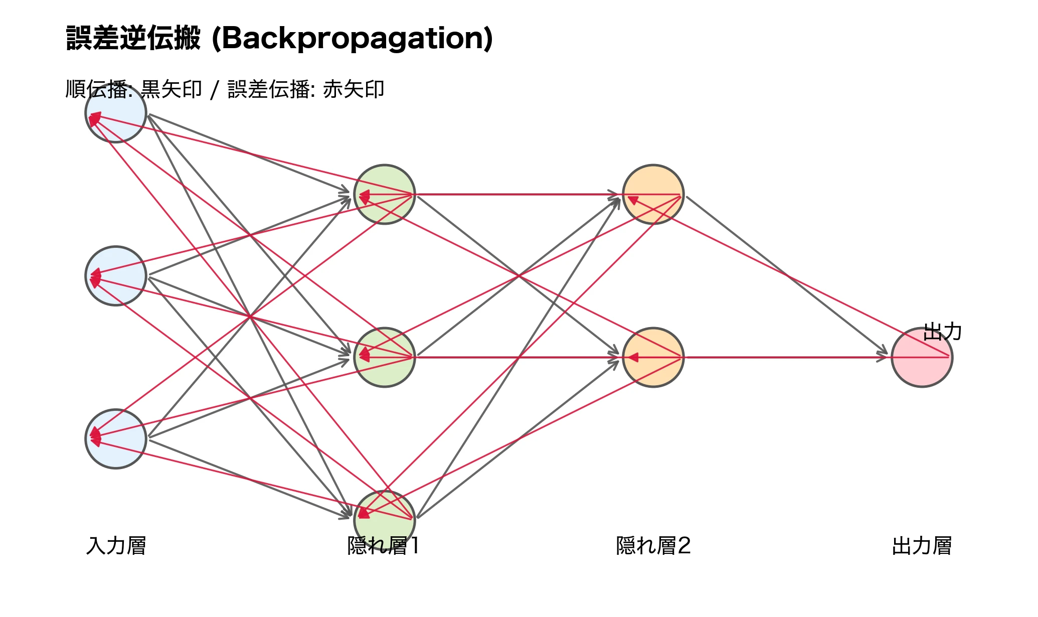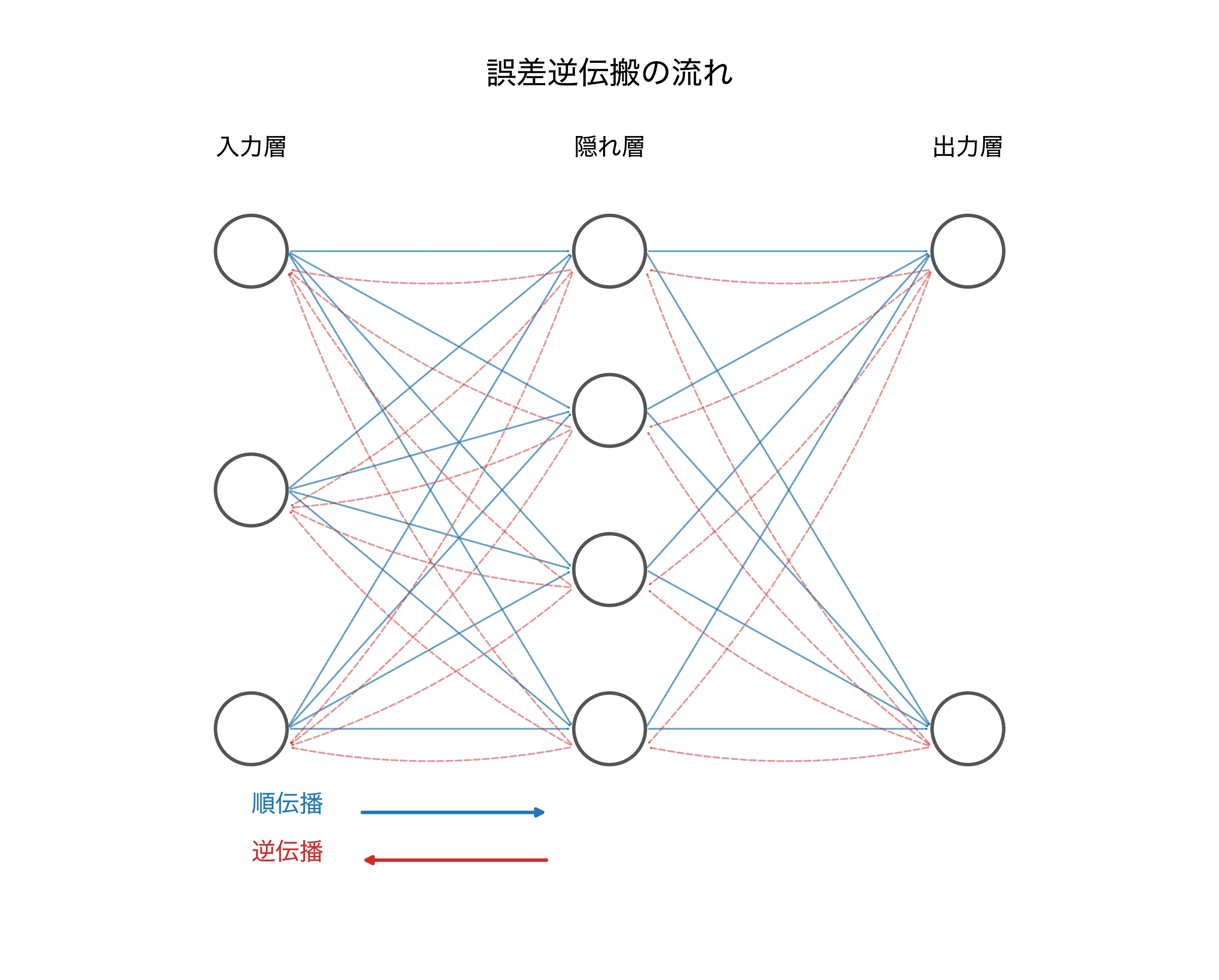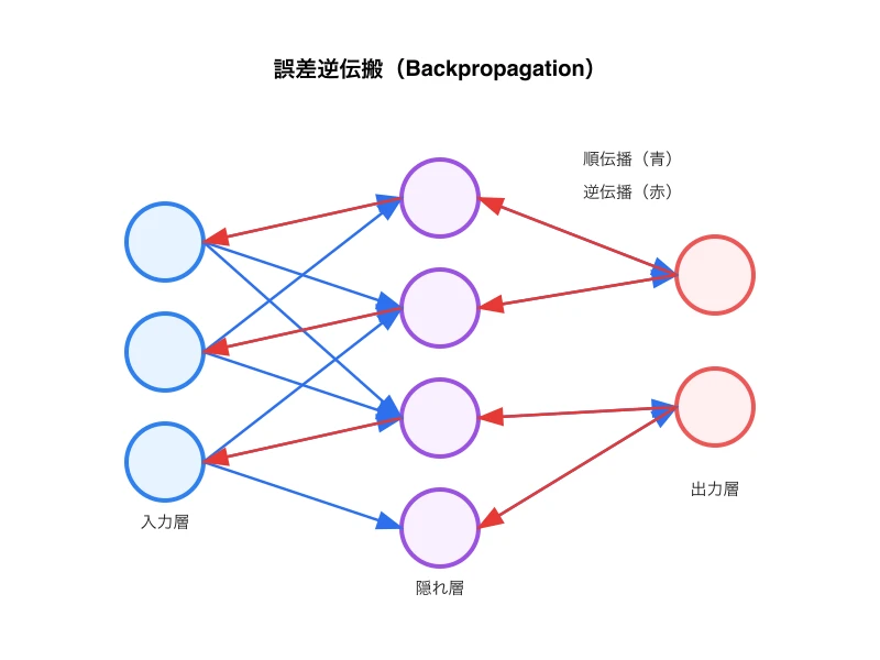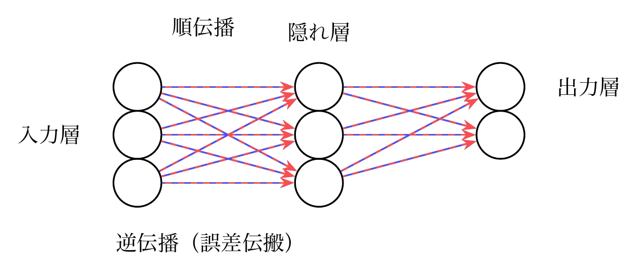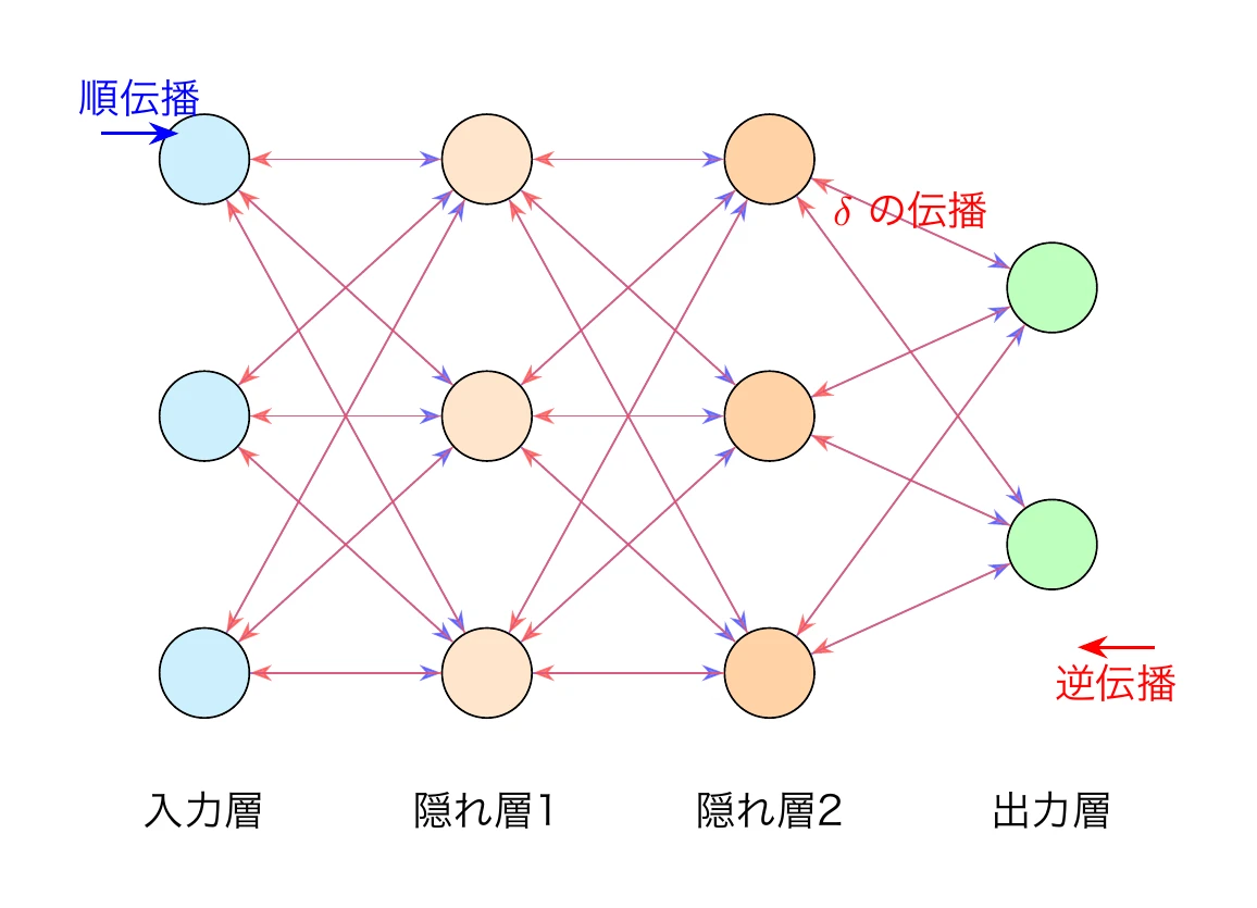 - 順伝播(青矢印)と逆伝播(赤矢印)を示す