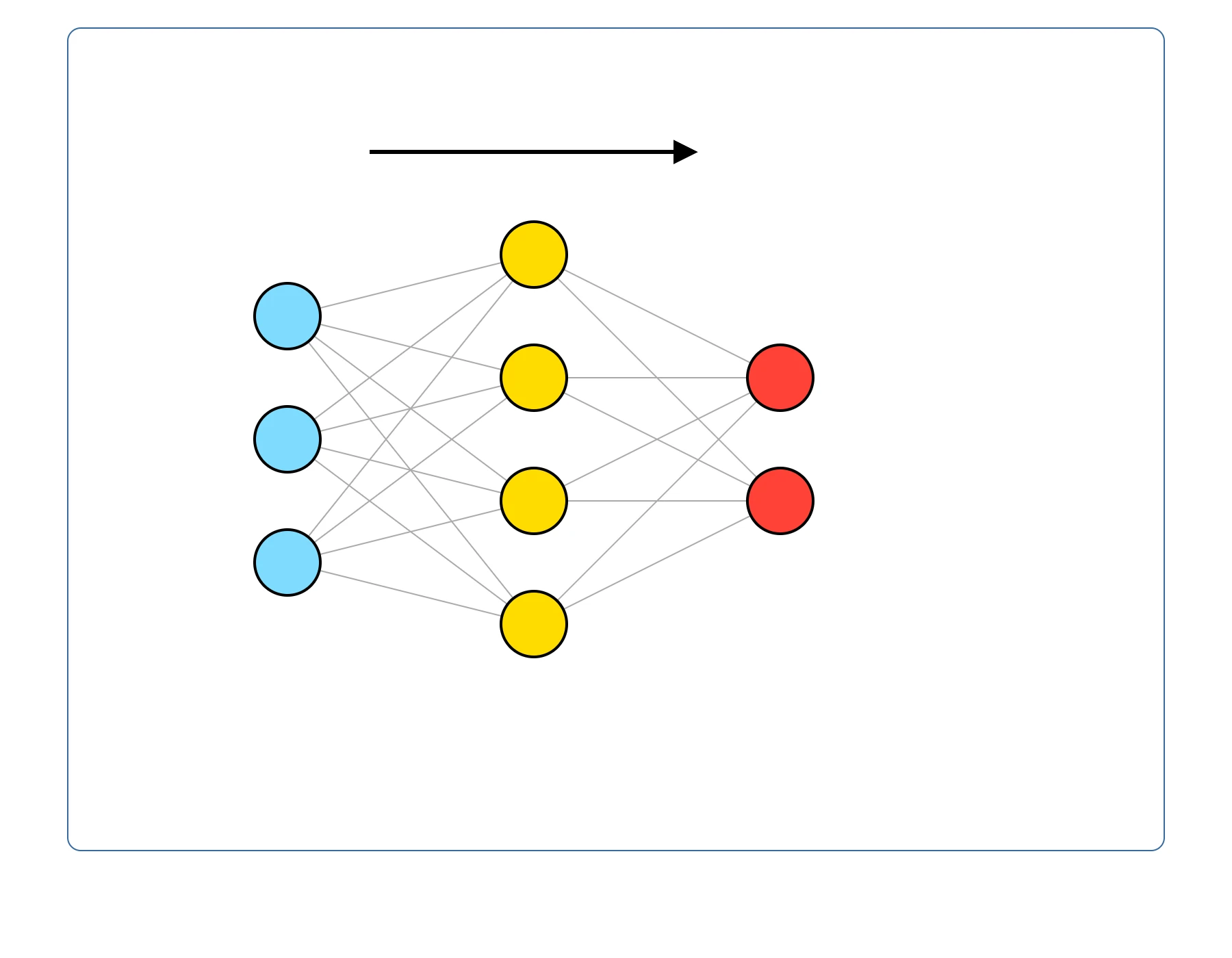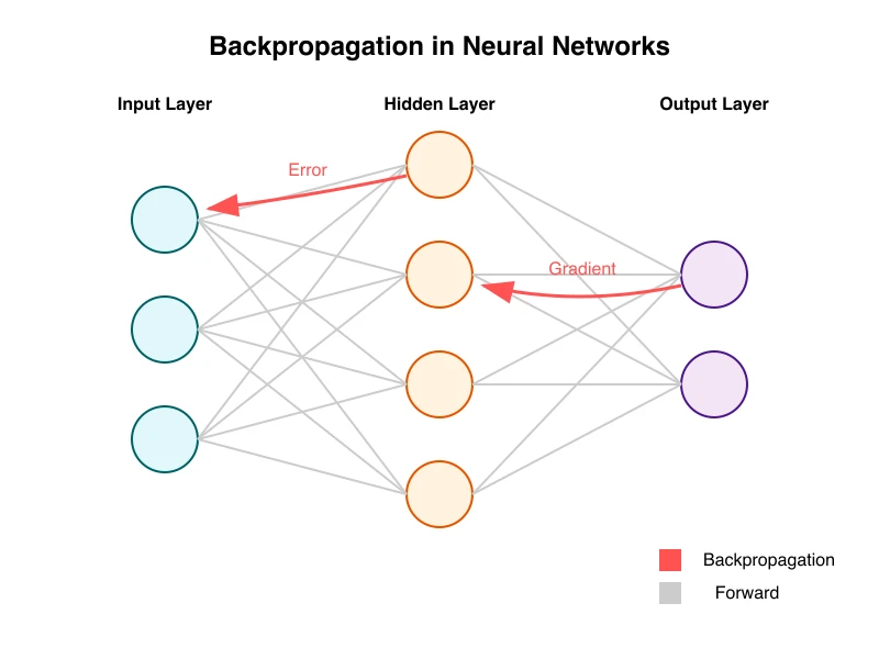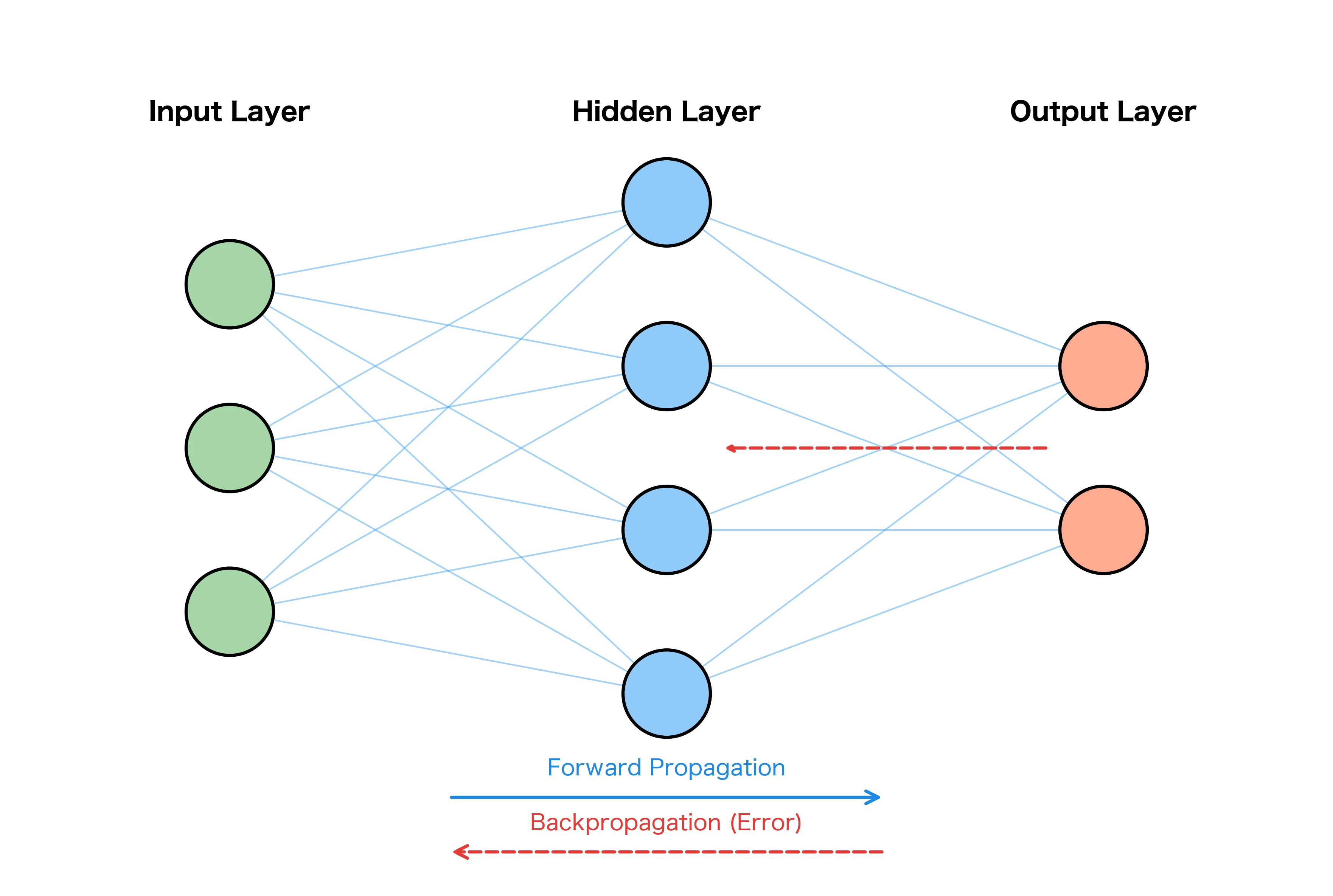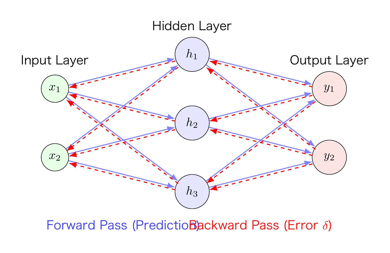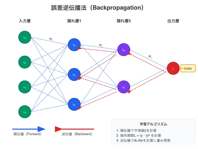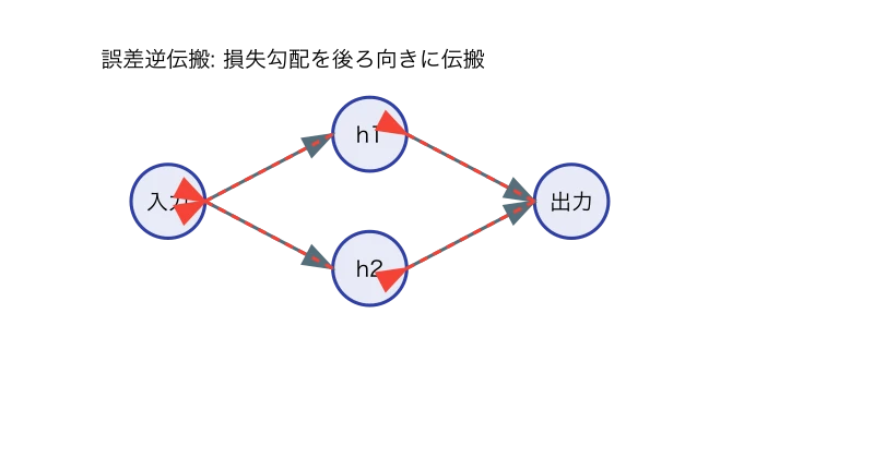 - 順伝播(青矢印)と逆伝播(赤矢印)を示す