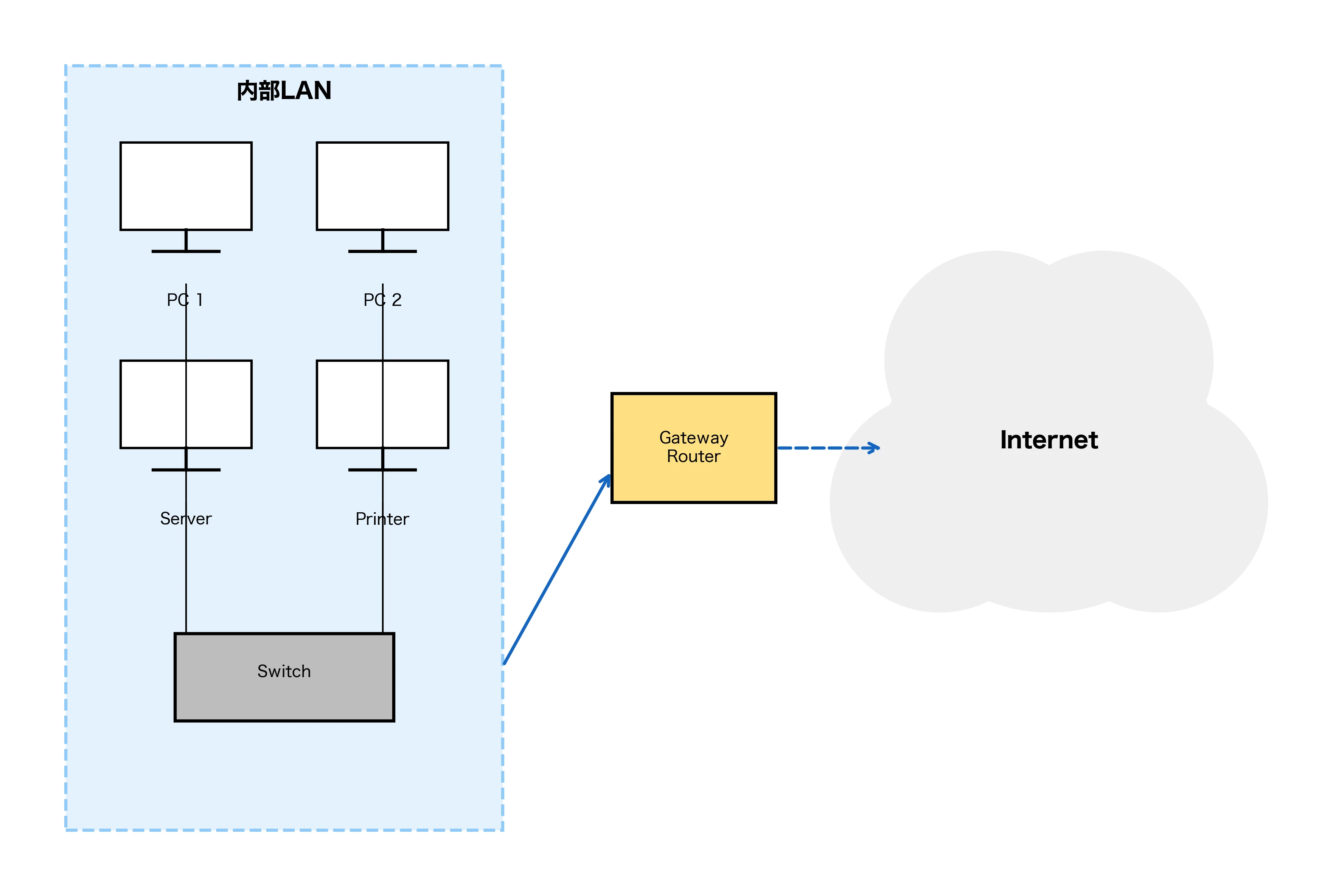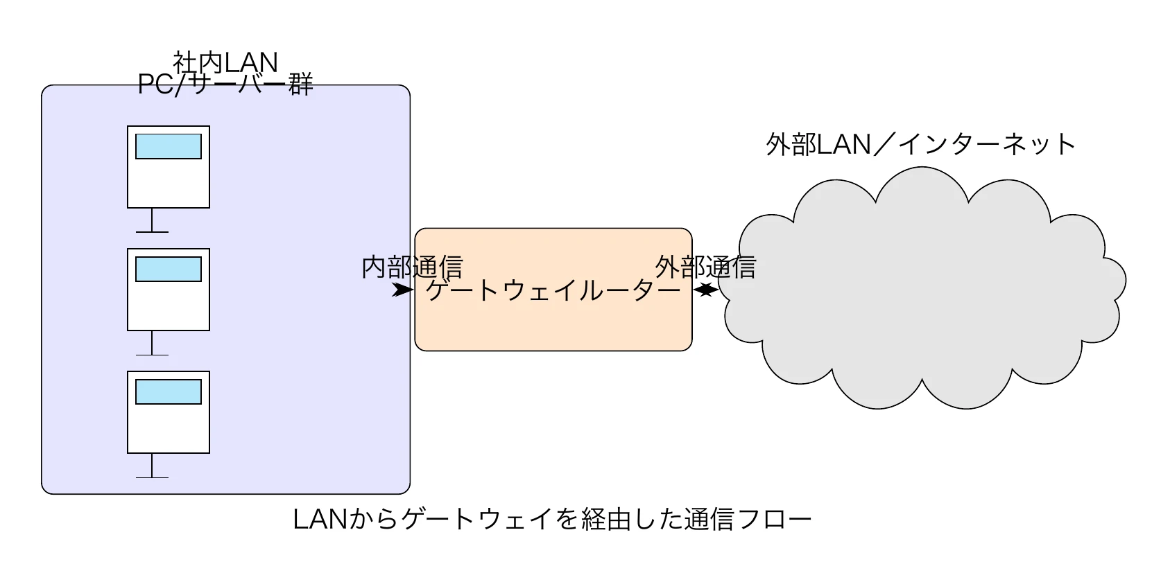 - 左側: 内部LAN(複数のPC/サーバーアイコン)