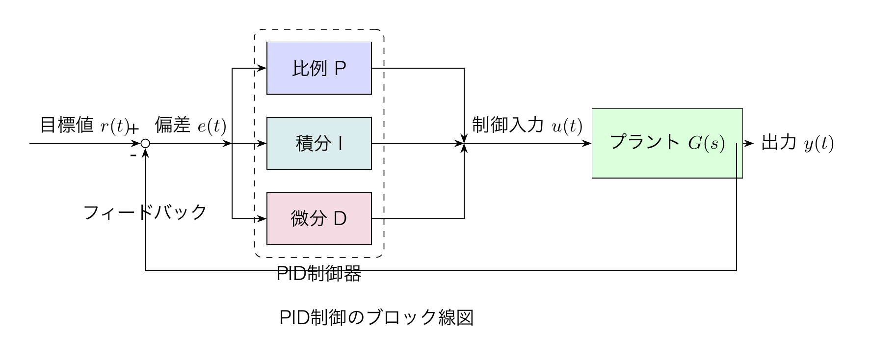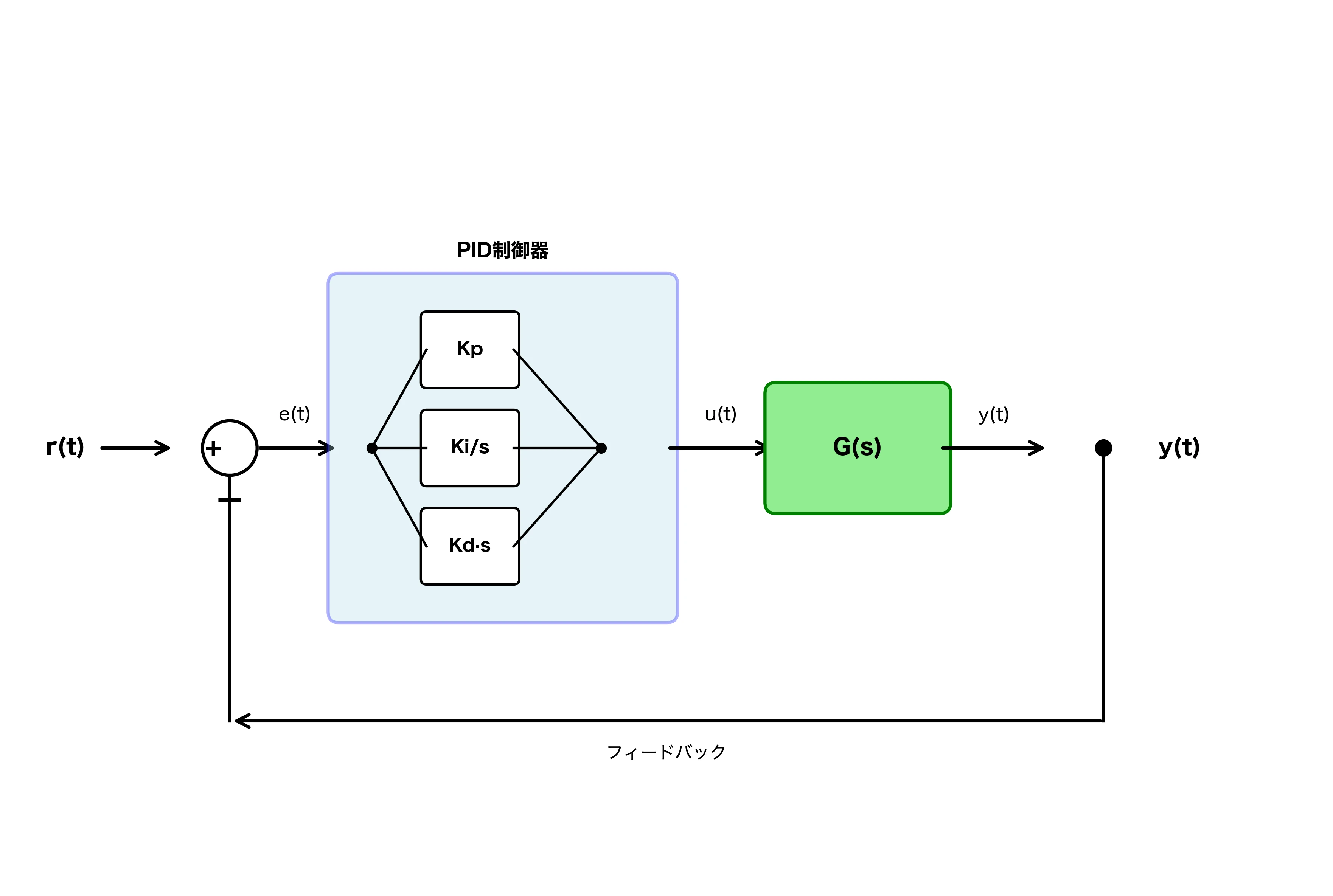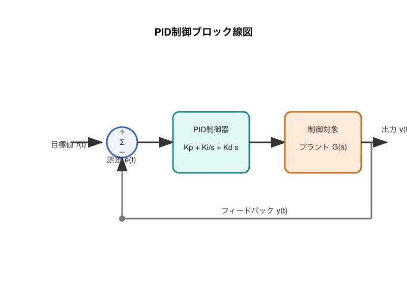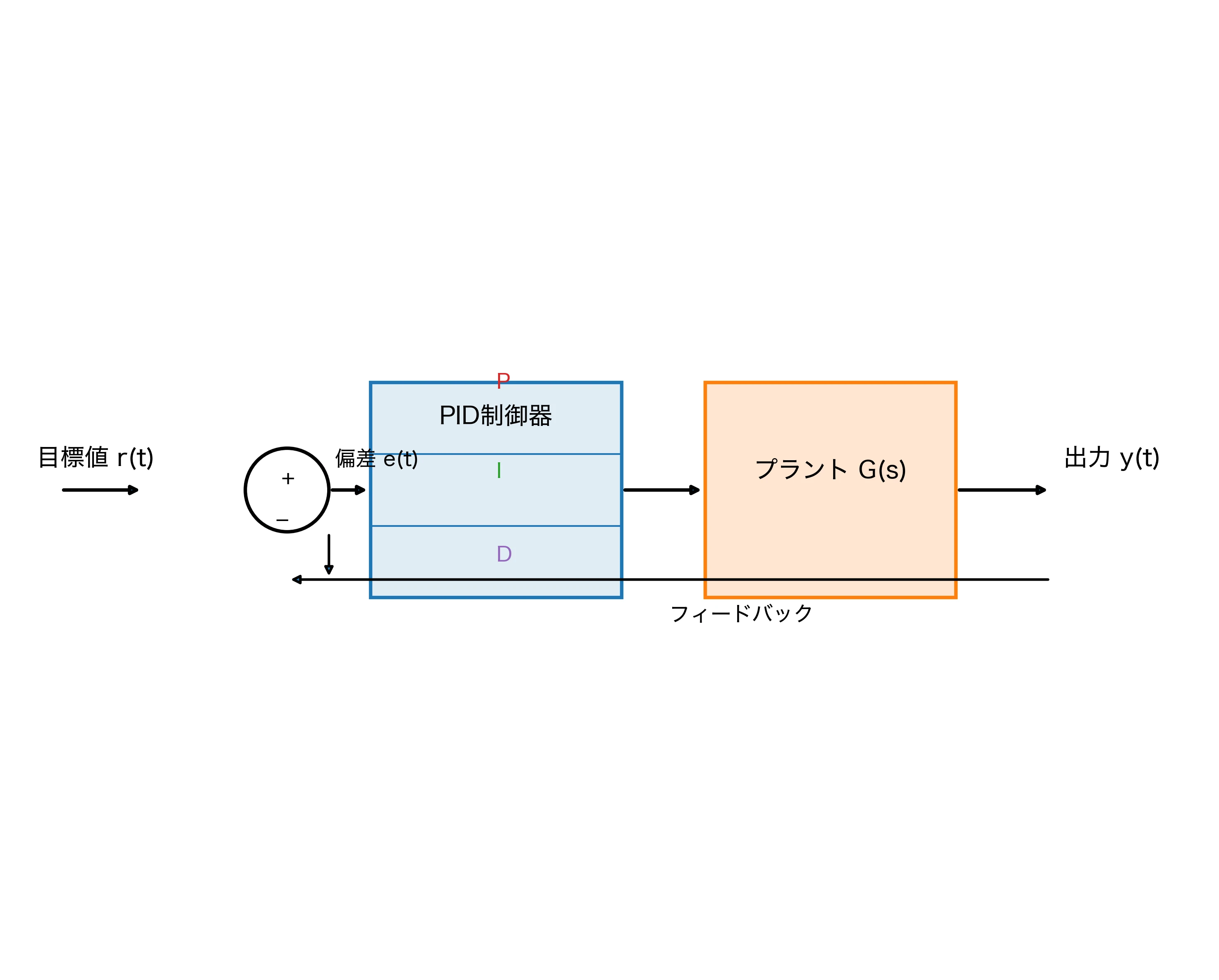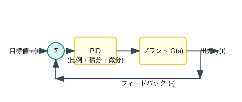 - 目標値r(t) → 加算点 → PID制御器 → プラントG(s) → 出力y(t)