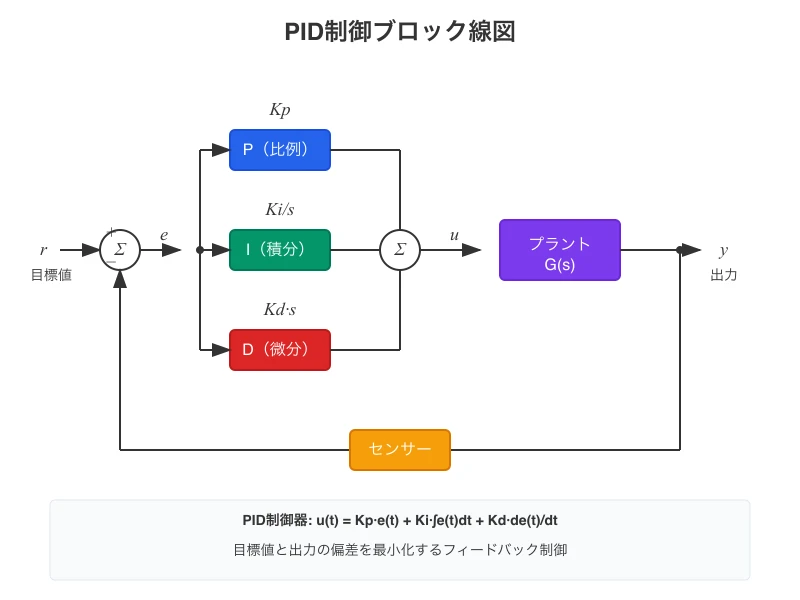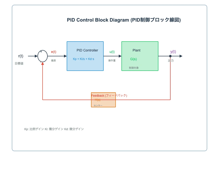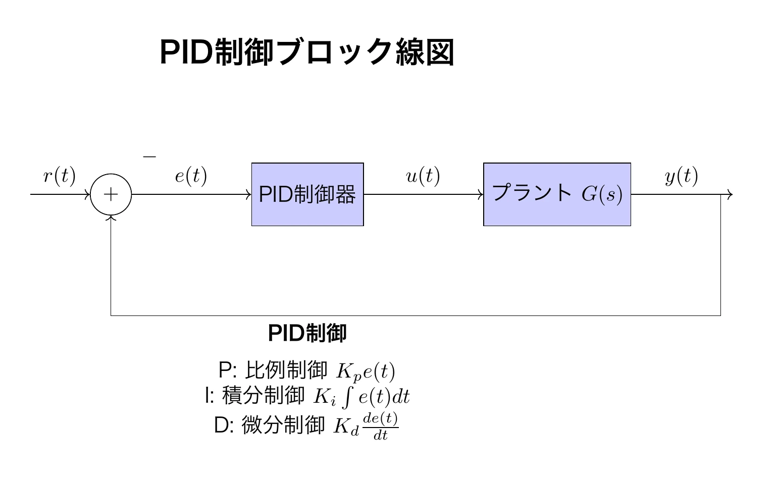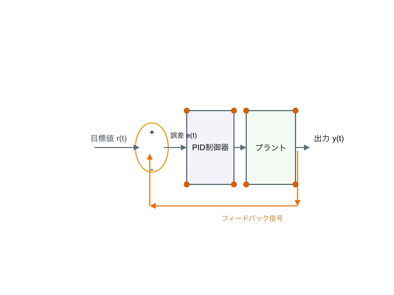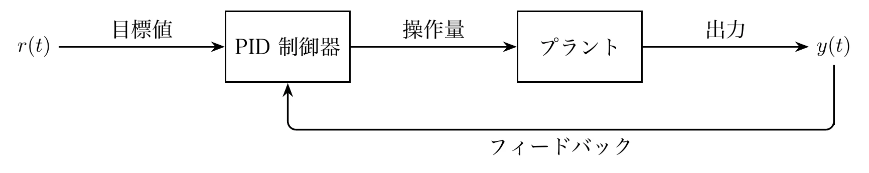 - 目標値r(t) → 加算点 → PID制御器 → プラントG(s) → 出力y(t)