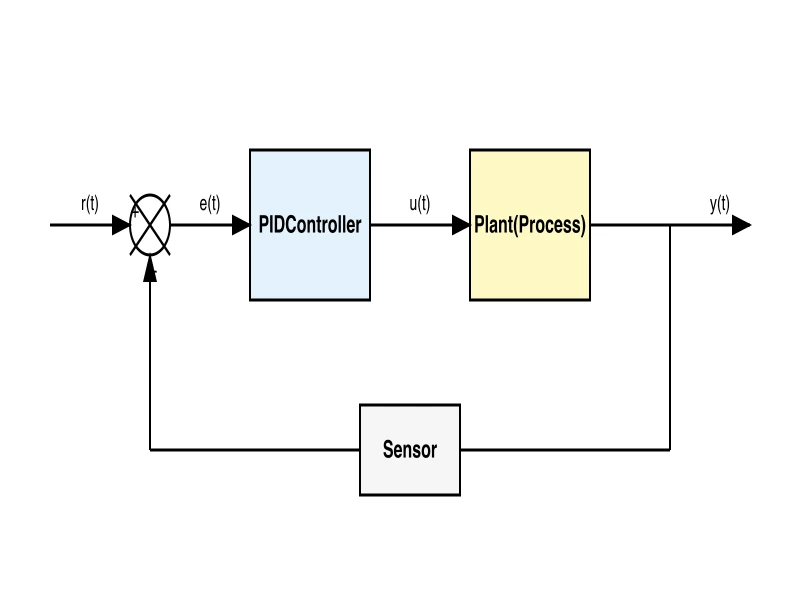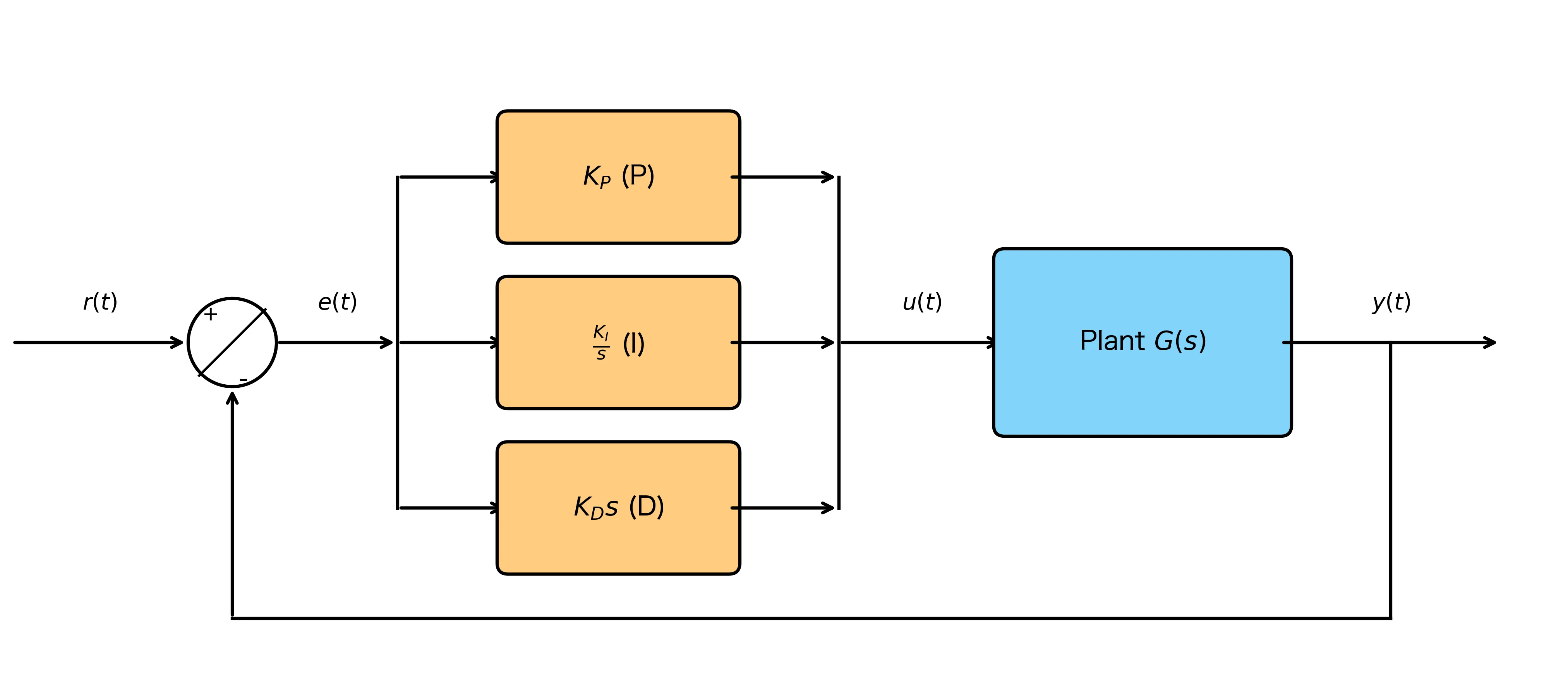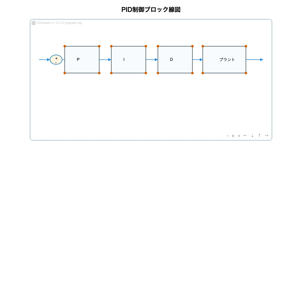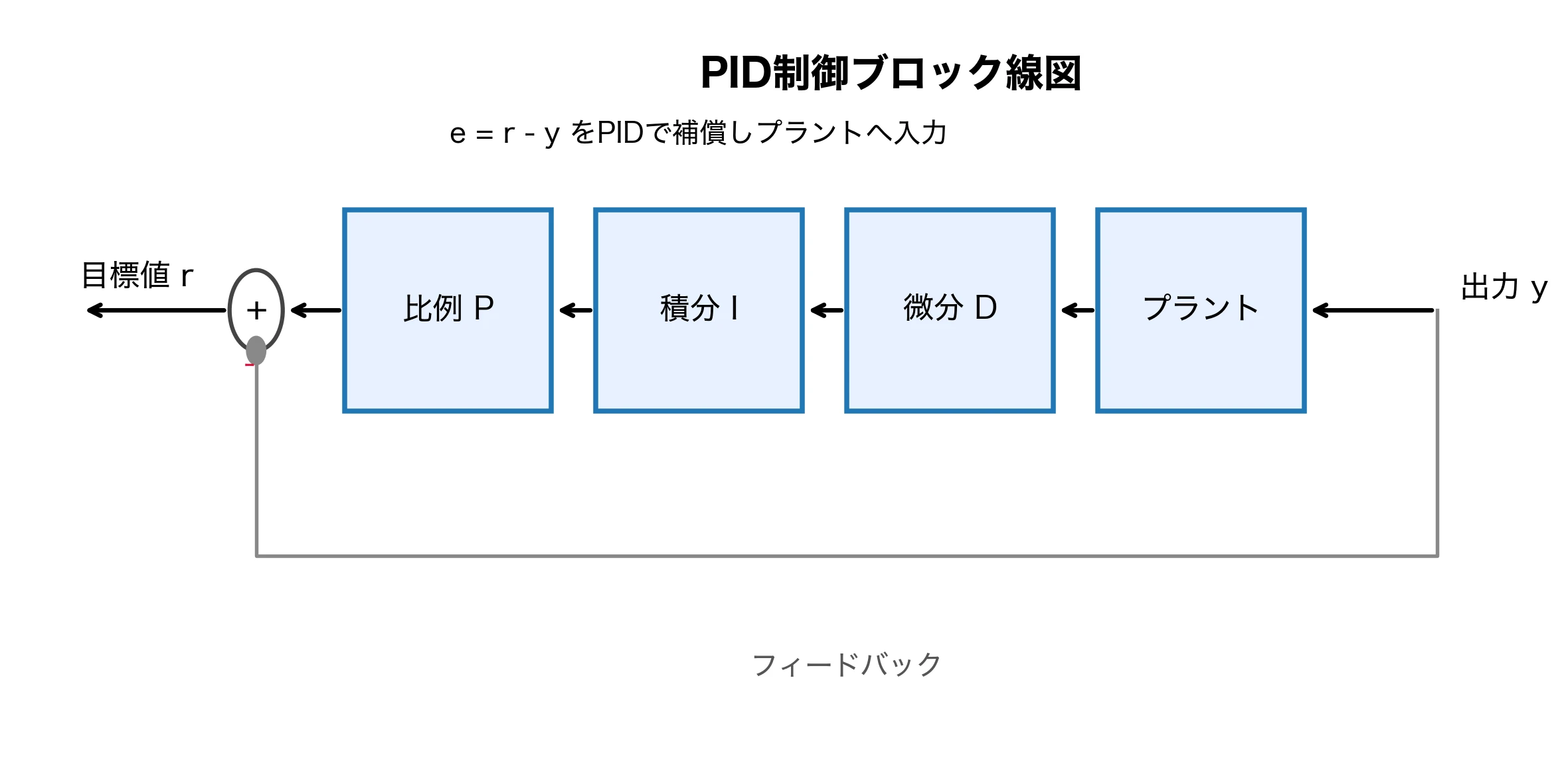 - 目標値r(t) → 加算点 → PID制御器 → プラントG(s) → 出力y(t)
