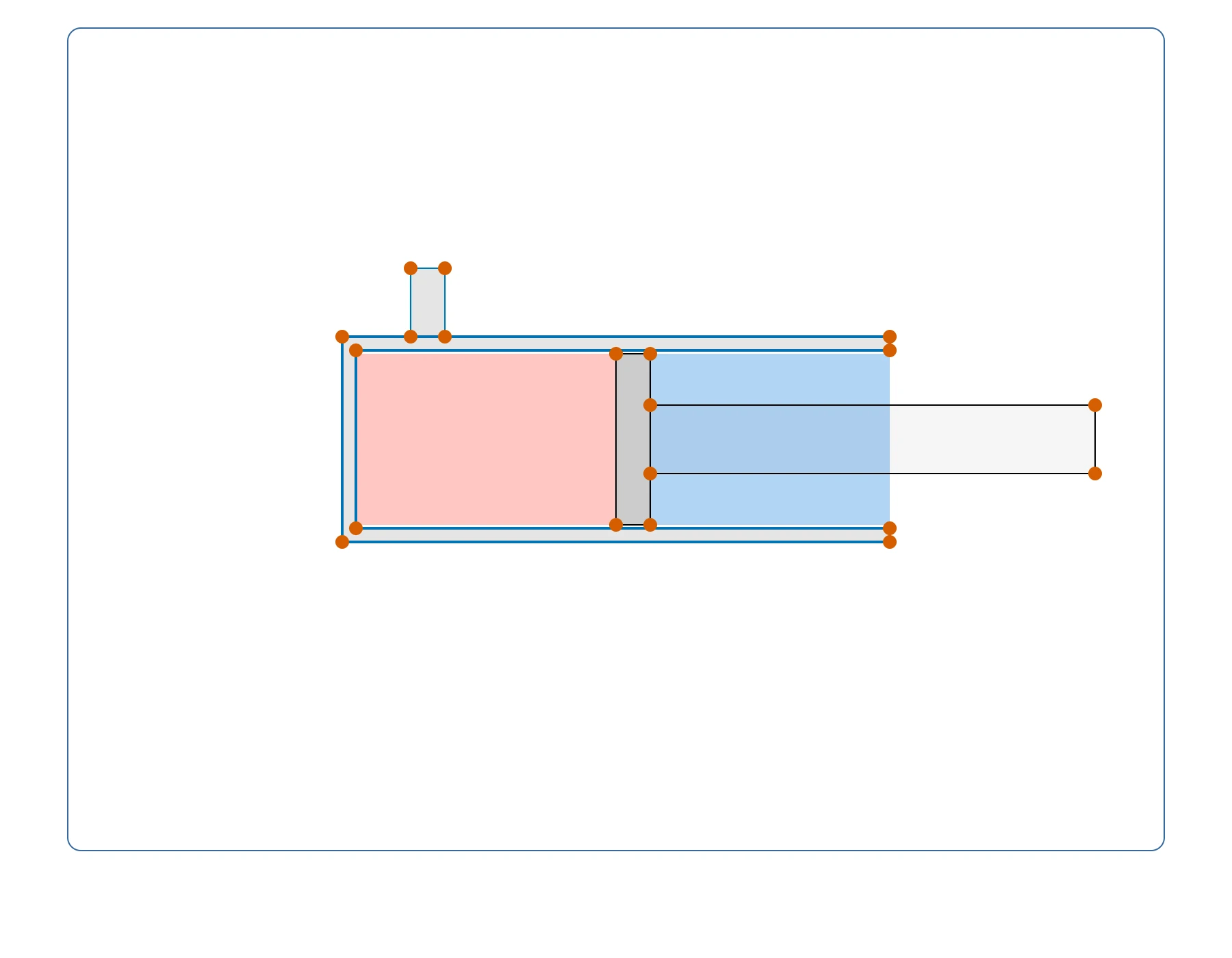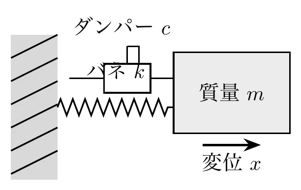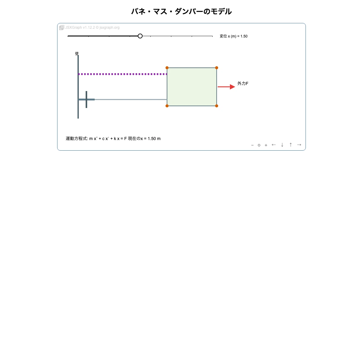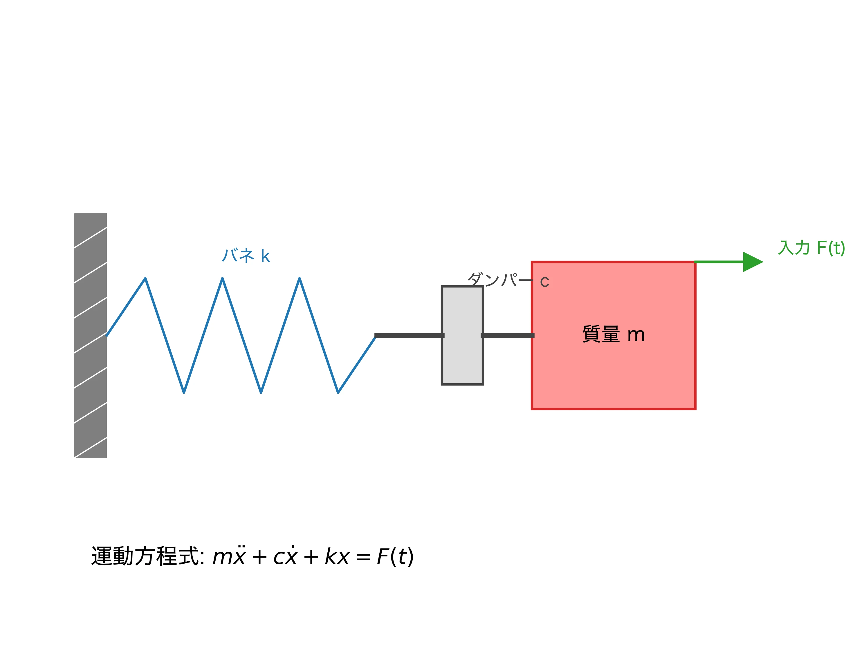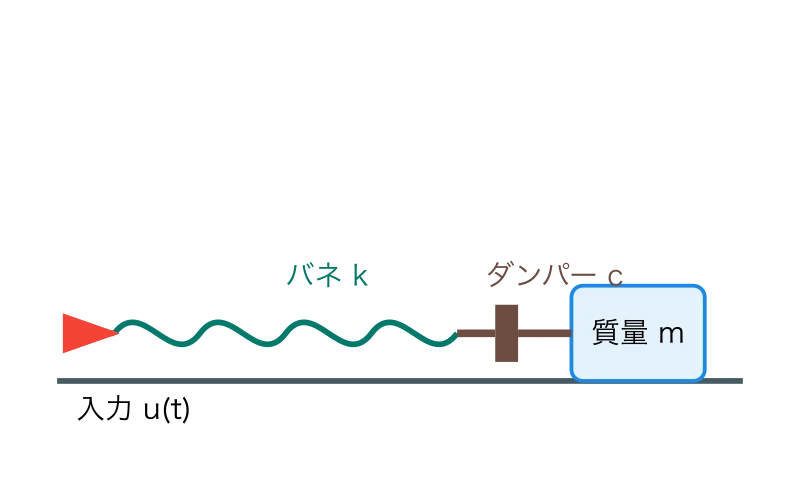 - 壁、バネ(zigzag)、ダンパー(四角形)、質量(箱)を水平に配置