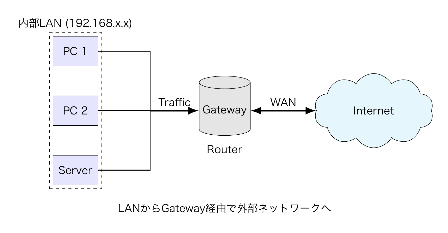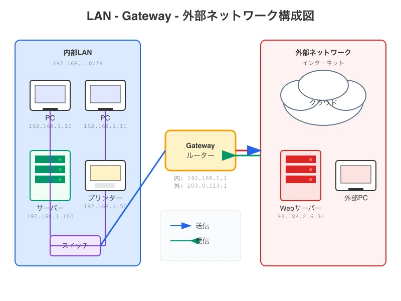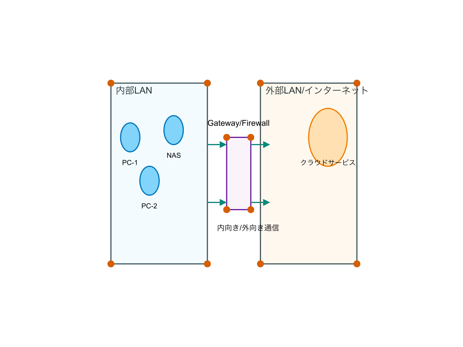 - 右側: 外部LAN/インターネット(クラウドアイコン)