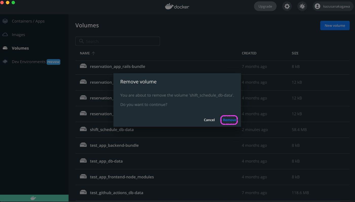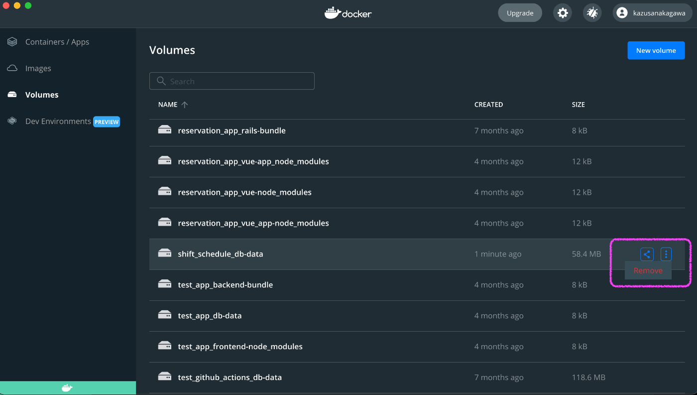 今回は、DBの中身を一掃しても問題なかったので、volumes