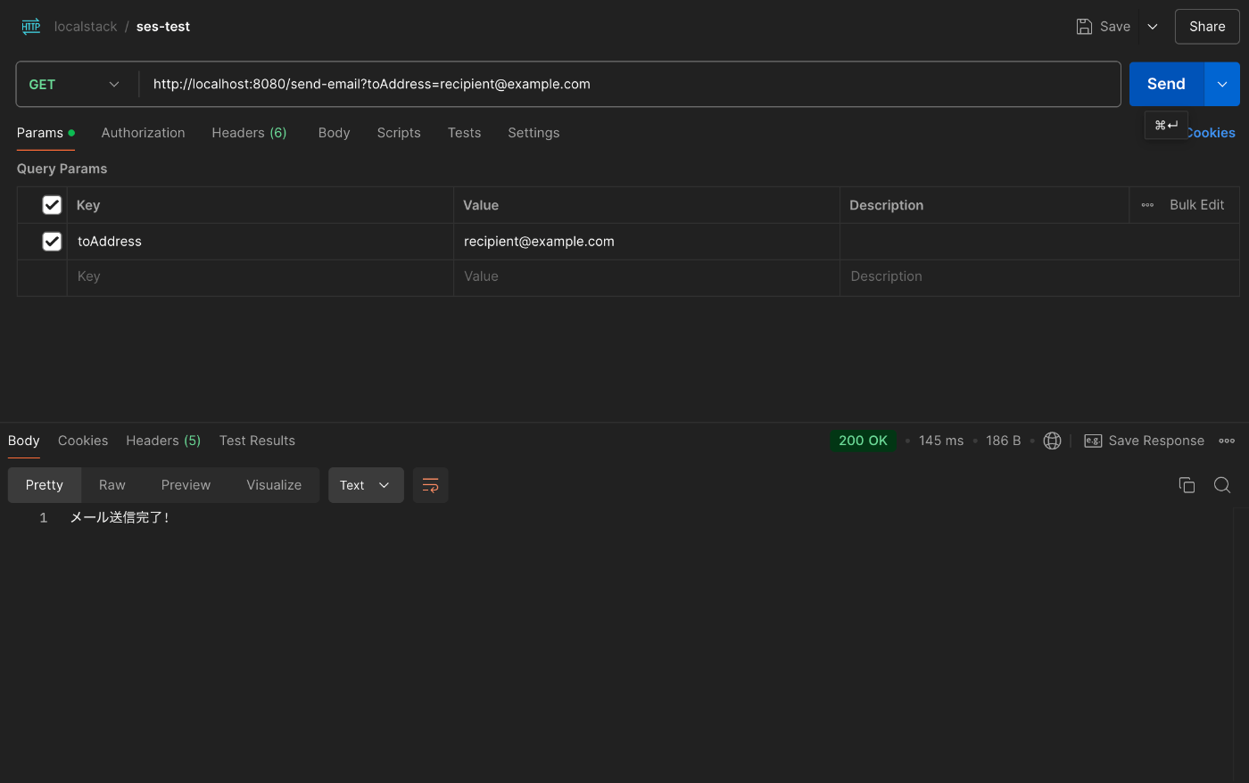 .endpointOverride(URI.create("http://localhost:4566")) // LocalStackのSESエンドポイント