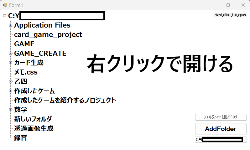 すべての要素が見えるのではなく、ファイルは見えないようになっている。グループを見たいのであって、各要素が見たいわけではないので、フォルダだけ見えるようにしている。AddFolderでフォルダを選択できる。vsでの開発は初めてなので、高速化はあまりしていない。読み込む階層を3階層までにしていて、それ以降は、そのフォルダを開いて、追加で登録する感じとしている。追加したフォルダは、履歴として残り、それを押すと、すぐに開ける。