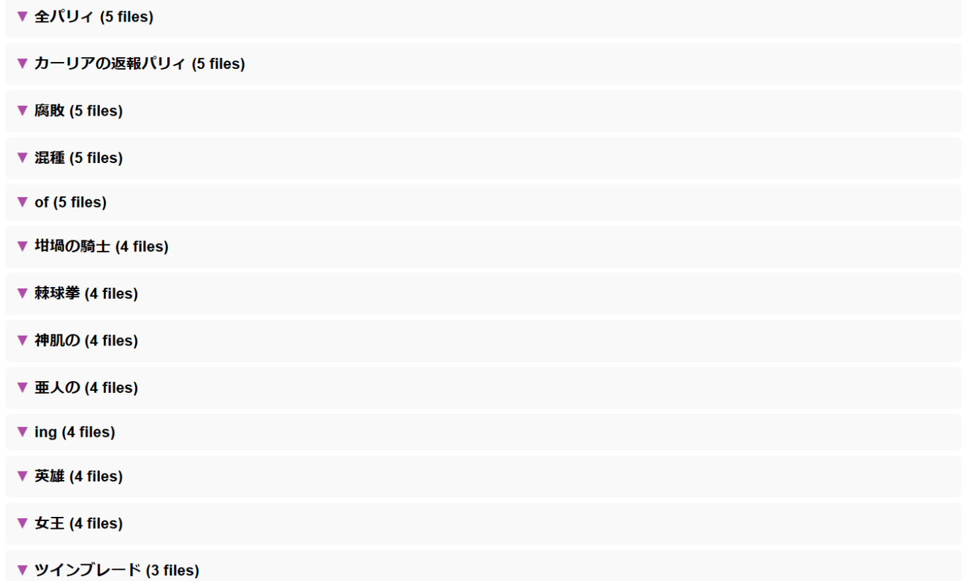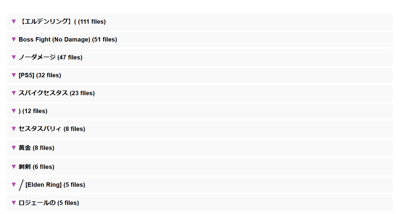 タイトル、ノーダメージのようなものの後に、武器種によるくくり、そのあと、敵の種類の区分などが出てきている。複数タイトルを突っ込むと、例えば、エルデンリング、ホロウナイトのように最初に並んでくれる。これは、朗読バージョンで試すと、作者ごとにいい感じに分かれてくれたのを確認している。