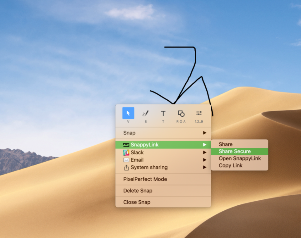画像上で右クリック→SnappyLink→ShareSecureを選択(URLが有効な時間と、Passwordを選択できるのでShareよりこちらのほうがおすすめ)