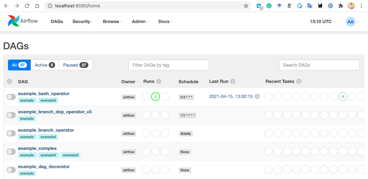 5506d594c661 apache/airflow:2.0.1 "/usr/bin/dumb-init …" About a minute ago Up 55 seconds (healthy) 0.0.0.0:8080->8080/tcp airflow-quick-start_airflow-webserver_1