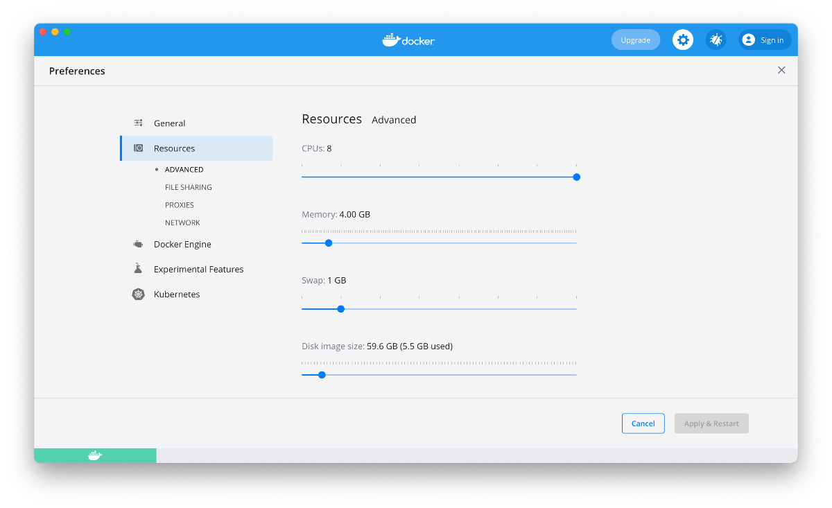 Dockerに割り当ててるメモリが足りないみたいなので(参照)メモリを増やした(2GB→4GB)。
