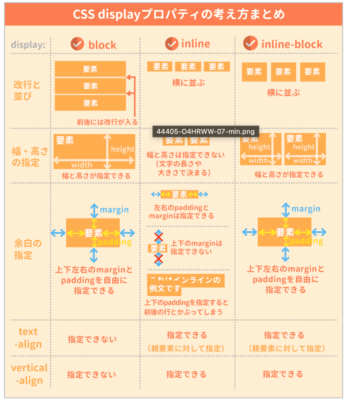 pタグはblock」「aタグはinline」というようにタグごとにdisplayプロパティの初期値が決まっています。