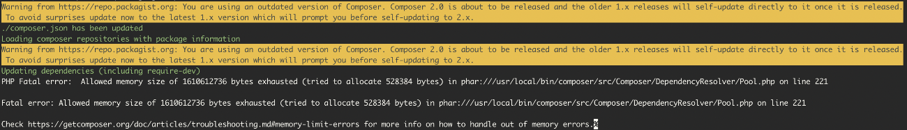 Googleで解決方法の検索を行うと、php.iniを編集しPHPのメモリ量を上げたり、Swapファイルを用意したりなどの解決策が多くヒットします。しかし、Composer自体のVersionを2系(未だpreview)にあげることで解消できる場合があるので共有です。