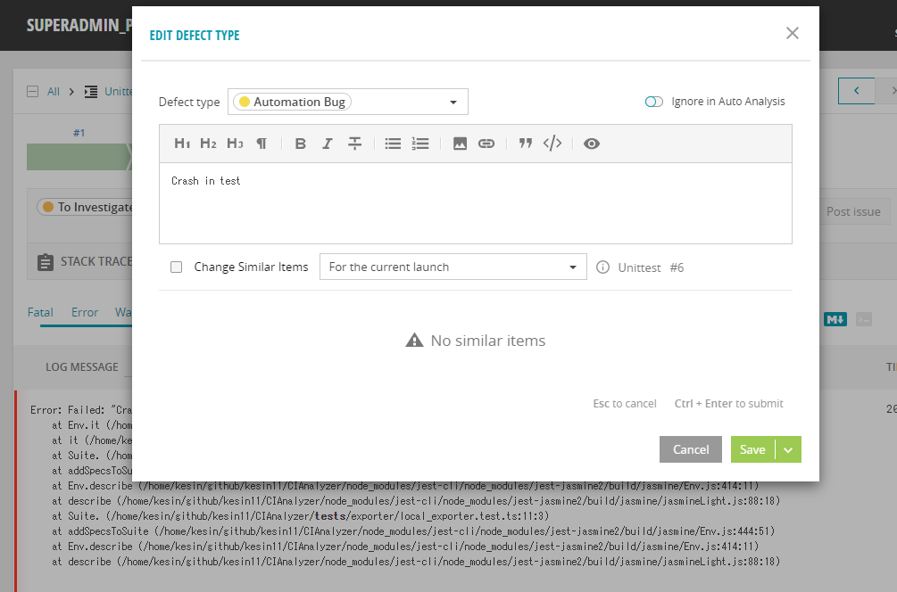 適当にわざとユニットテストでexpectの値を書き換えてfailにしたテストケースのDEFECT TYPEを"To Investigate"から"Automation Bug"に変更し、コメントも残してみました。