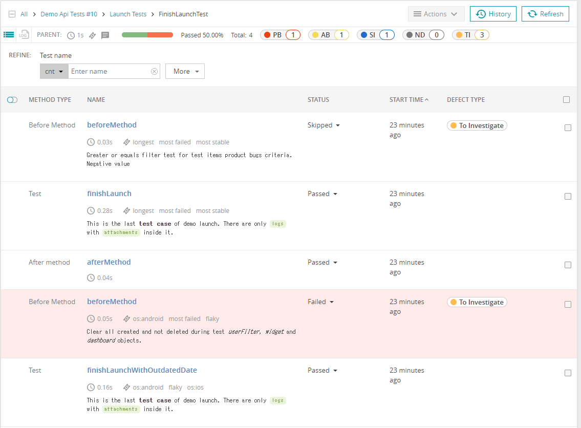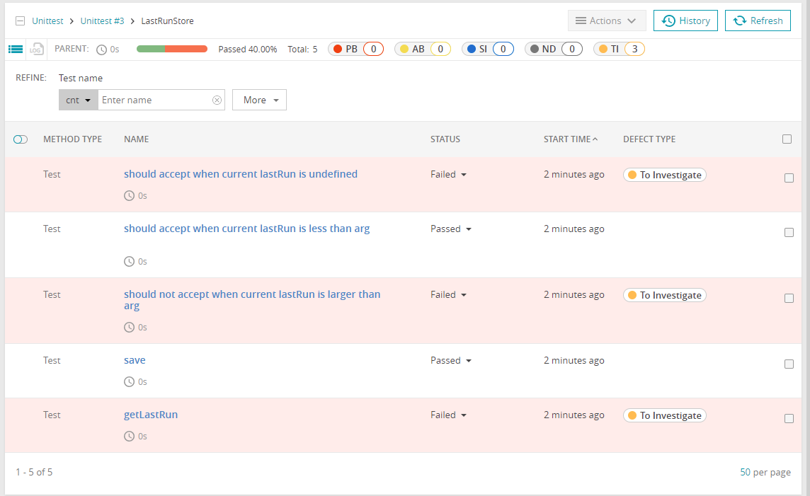 いくつかのテストをわざと失敗させていました。テスト一覧の画面ではFailしたテストに自動的に「To Investigate」のラベルが付くようです。
