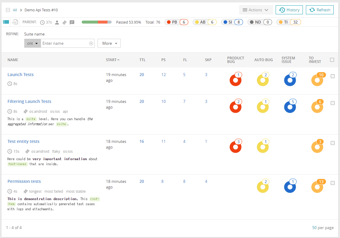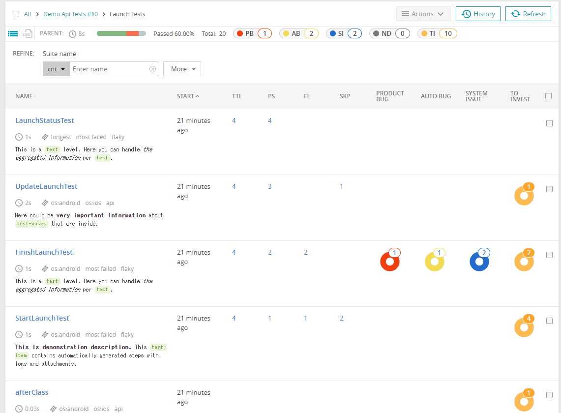 過去のステータス変更や、タグの情報や説明を付けられるらしい。自動テストの結果に対して、1つ1つ説明を追加したり修正すべき問題であるなどの情報を付けられるということかな
