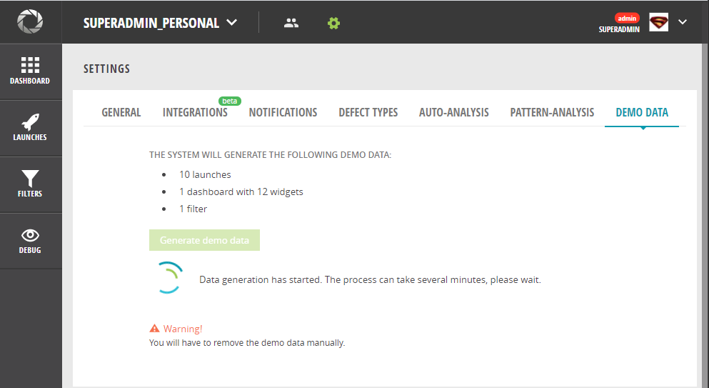 立ち上げたらlocalhost:8080でReportPortalのログイン画面にアクセスできます。ドキュメントを見ると一般ユーザーとadminの2つのデフォルトアカウントが用意されていると書かれており、id/passが書いてあるのでadminであるsuperadminのアカウントでログインします。