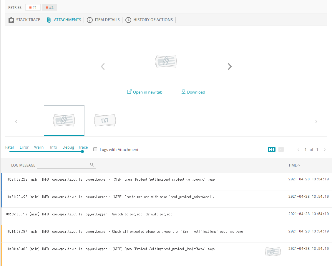 さらにログ中にアタッチメントとしてファイルをつけることもできるようです。このサンプルではpdf, txt, htmlぐらいしか見つけられませんでしたがE2Eテストであれば画像や動画などを付けると重宝しそう。