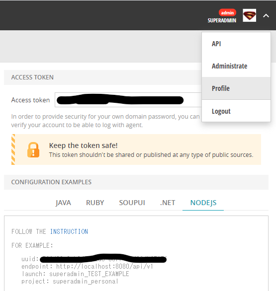 token, endpoint, projectについてはユーザーのプロフィールページに表示されている情報を入れる必要があります。
