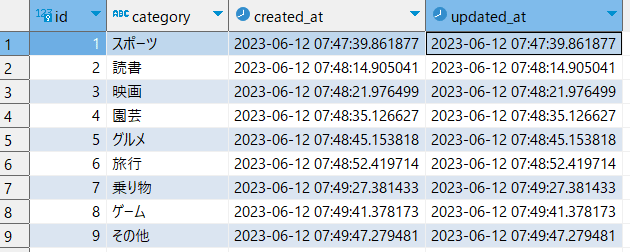 ~ 以下 {id: 9, category: "その他"} まで同様に作成 ~