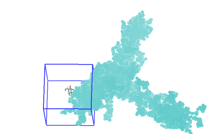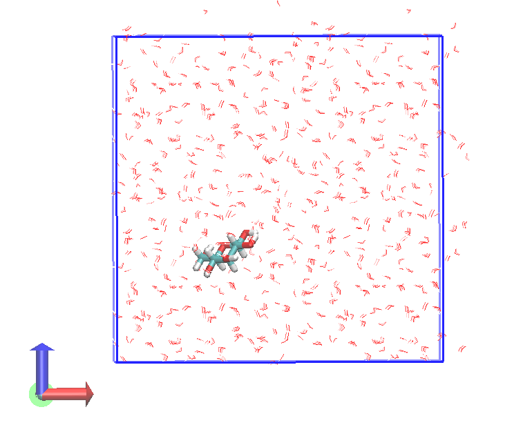 一見、molと似ていますが、trjconv時にgroup for clusteringで指定したグルコース([GLC])のみが修正されており、そのほかの水分子は修正されておらず、もとのトラジェクトリ同様途切れまくっています。