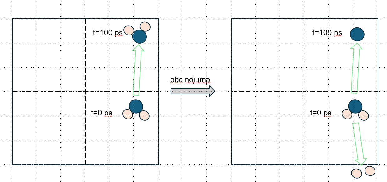 水の拡散係数は 2.30 × 10-9 m^2s^(-1)などで、これをもとに平均速度を計算すると、今回のトラジェクトリ保存間隔である100 psの間に1.175 nm程度動くようです。ボックスサイズは一辺3 nm程度なので、原子によっては1フレーム(=100 ps)の間にxyzいずれかの方向にボックスの半分以上動いてしまうのはあり得そうです。そして、ある水分子のうち、例えば水素はギリギリボックスの半分以上動いていて、酸素がギリギリ半分以下しか動いてないなら、酸素は-pbc nojumpにより反対側に飛ばされてしまいます(下図)。そうすることで、変位がボックスの半分以下に収まるためです。