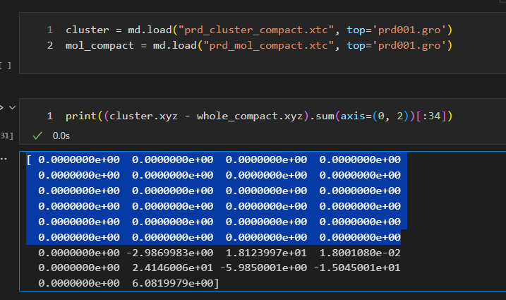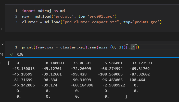 最近Trajectoryクラスのドキュメントを見ていて、make_molecules_whole()やimage_molecules()というメソッドがあるのを見つけました。この辺で上のtrjconv -pbcと似たようなことができそうですが、.tprなどのトポロジー情報を読み込めないため、どことどこが同じ分子なのか認識できなそうです。ちょっと試した感じ、タンパク質はある程度トポロジーを自動認識できそうですが、-pbc mol, -pbc wholeに相当する操作をしたい場合、小分子の場合はメソッドの引数としてあらわに指定してあげる必要がありそうでした。すごく小さい分子であれば手動でも何とかなるかもしれませんが、そんな面倒なことをするくらいならgmx trjconvで処理してからmdtrajに渡した方がずっと楽そうです。