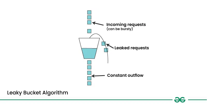 リーキーバケットは、底に穴の開いたバケツをイメージします。リクエストは上から水として注がれ、バケツから一定のレートで漏れ出します(処理されます)。バケツが満杯になると、新しいリクエストは溢れて拒否されます。