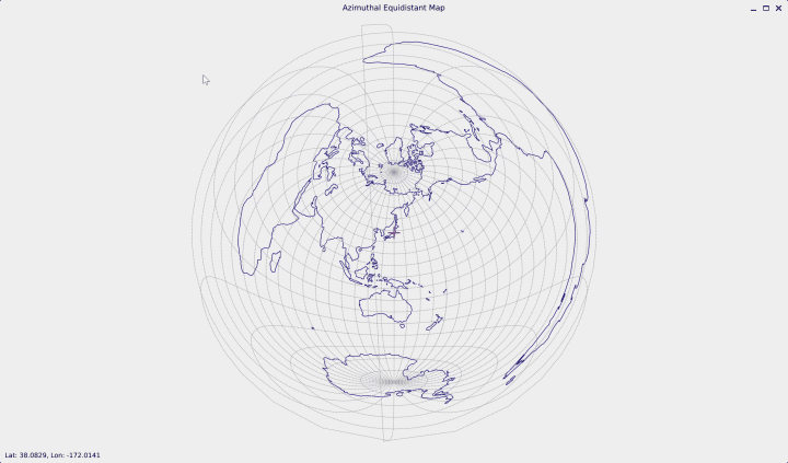 正距方位図法で、十字キーで中心地点を移動して、海岸線データの投影を計算して再描画する。
