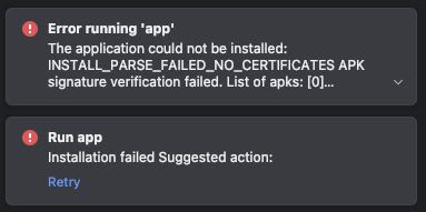 The application could not be installed: INSTALL_PARSE_FAILED_NO_CERTIFICATES APK signature verification failed. List of apks: [0] '/Users/xxxxxxxx/hoge/app/build/intermediates/extracted_apks/release/extractApksFromBundleForRelease/base-en.apk' [1] '/Users/xxxxxxxx/hoge/app/build/intermediates/extracted_apks/release/extractApksFromBundleForRelease/base-arm64_v8a.apk' [2] '/Users/xxxxxxxx/hoge/app/build/intermediates/extracted_apks/release/extractApksFromBundleForRelease/base-xxhdpi.apk' [3] '/Users/xxxxxxxx/hoge/app/build/intermediates/extracted_apks/release/extractApksFromBundleForRelease/base-master.apk'