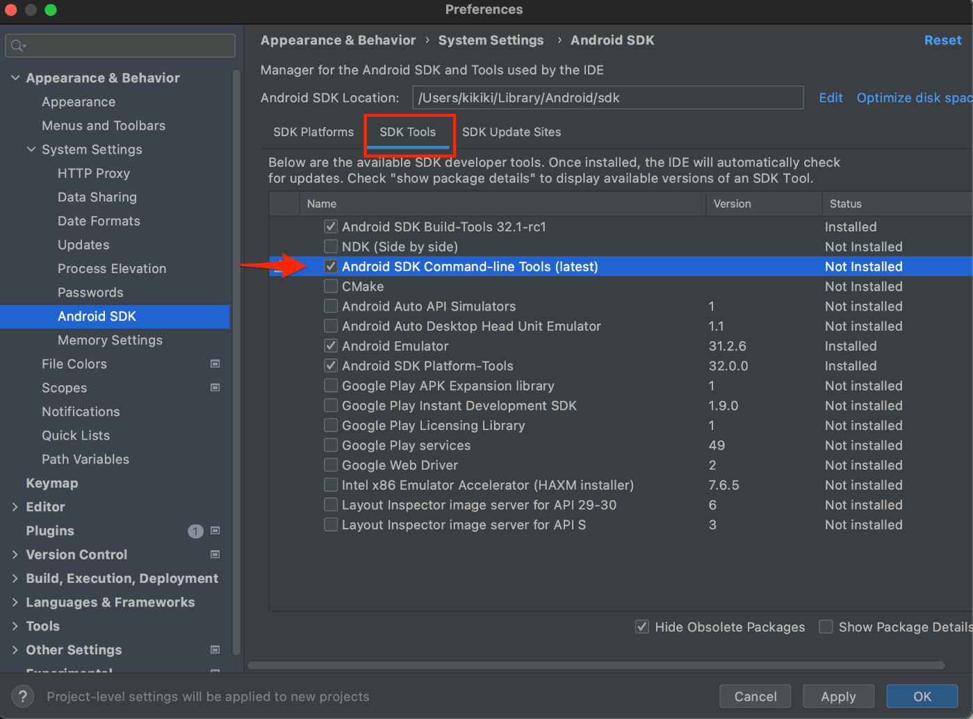 解決方法の記事には Android SDK から Command-line Tools にチェックを入れれば良いと書かれている記事が多いけど、そもそもその項目がない。先に 3. の cmdline-tools の問題を解決しなければだめっぽい