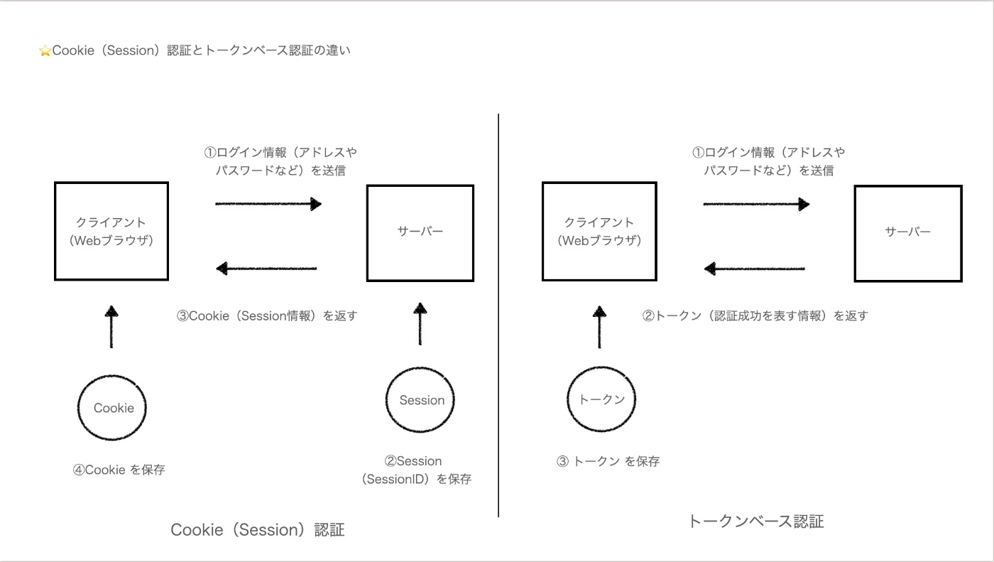 つまり、Cookie(Session)認証とトークンベース認証の違いは、サーバ側にsession情報(認証のための情報)があるかないかということです。(トークンベース認証の場合、トークンが返却されたということは認証成功したということなので、認証するためのSessionなどの情報は不要ということです。)