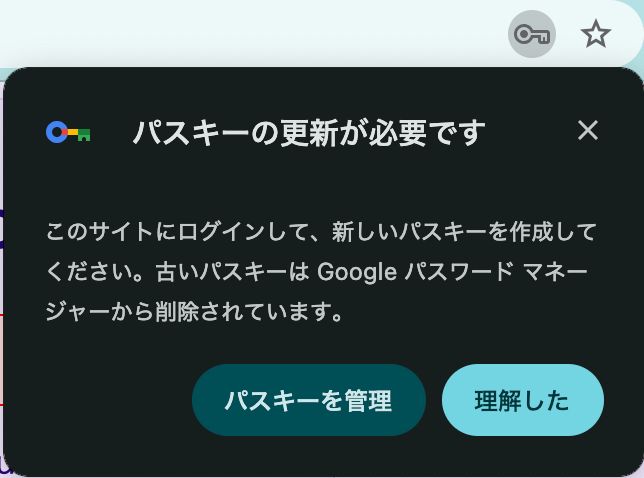 の「パスキー管理」、「理解した」はどのような気持ちでクリックすればいいんだろう...)