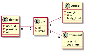 また、Userに紐づくモデルとして、ArticleやCommentなどがあります。